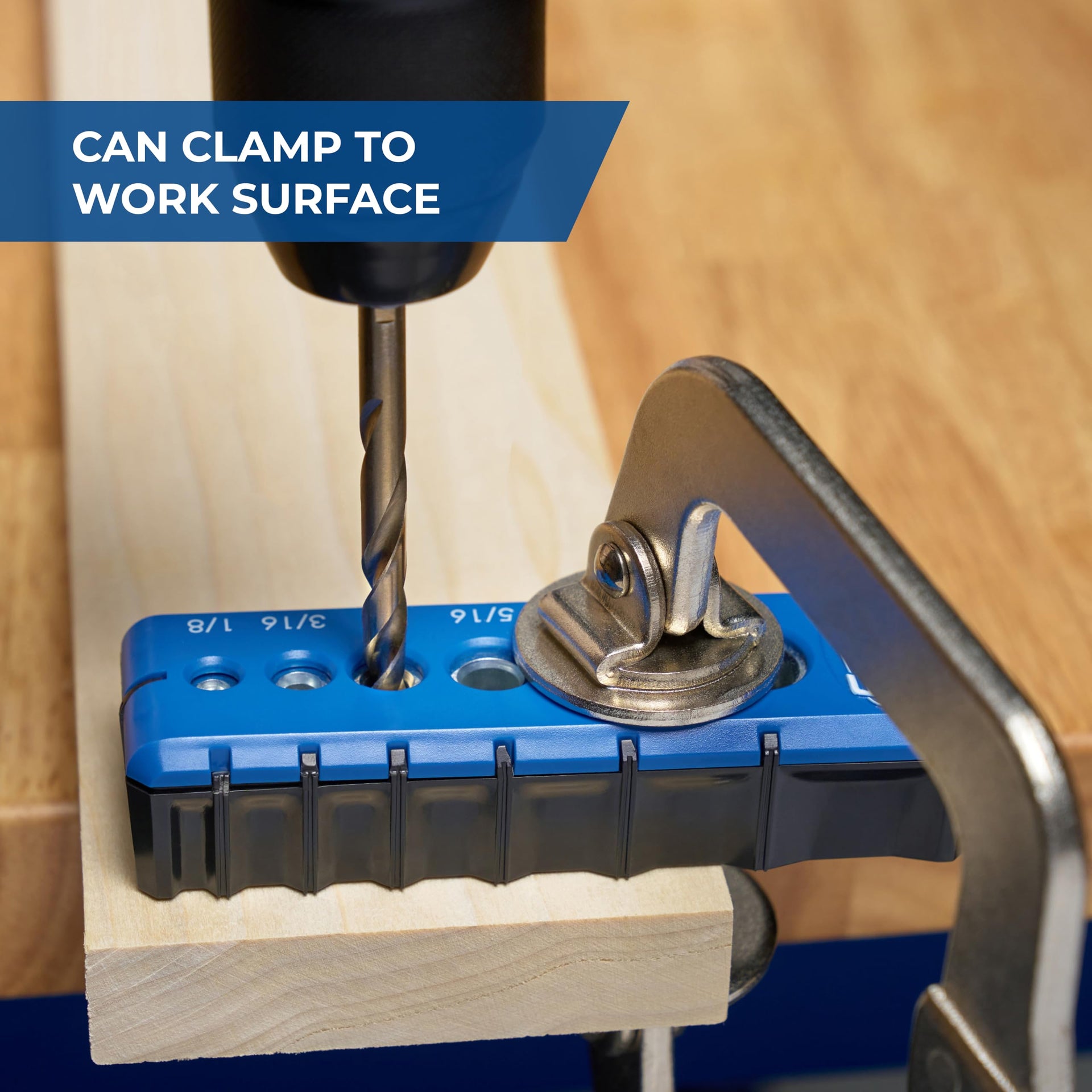 - Multiple Drill Guide Sizes: This woodworking tool features guide sizes of 1/8, 3/16, 1/4, 5/16, 3/8, and 1/2 of an inch