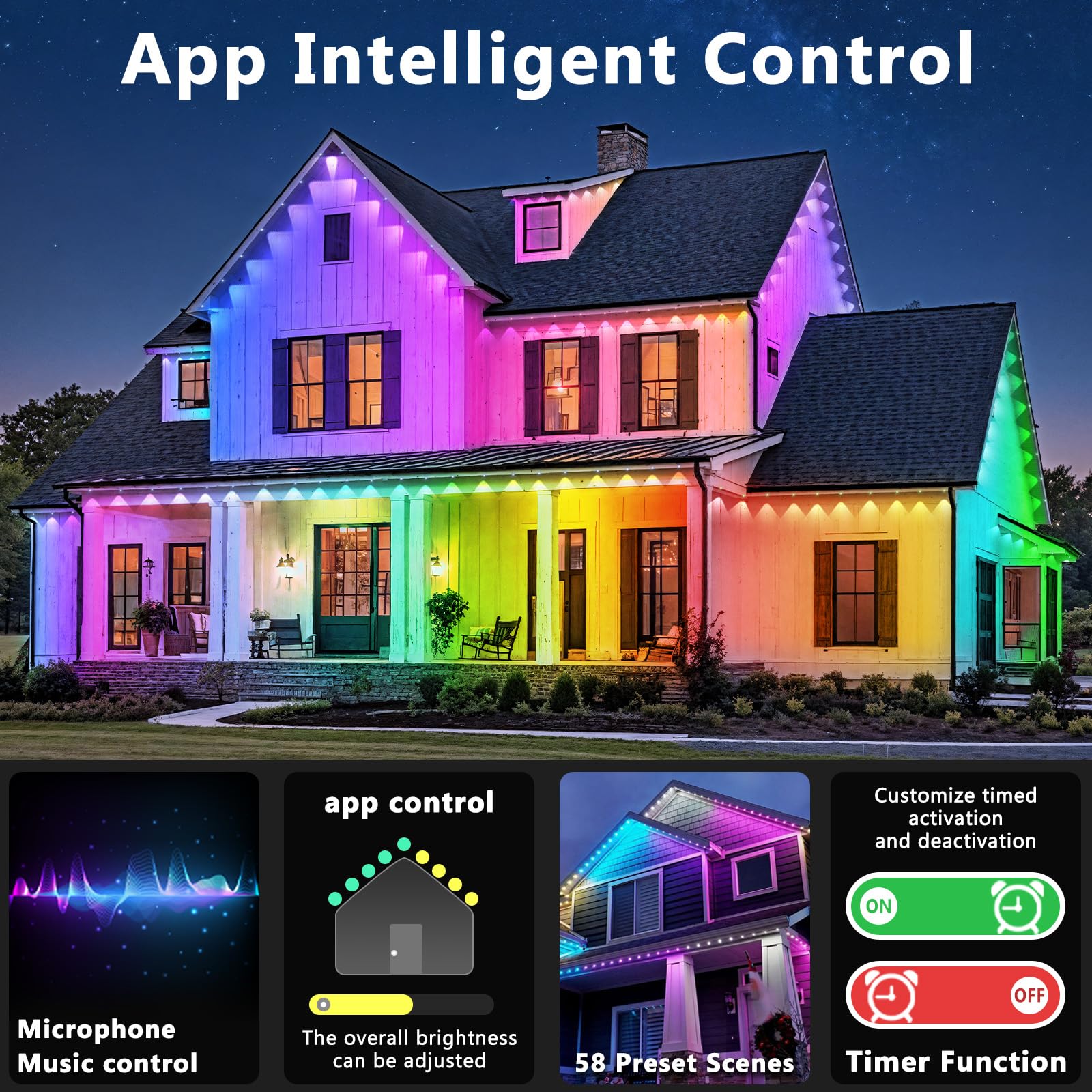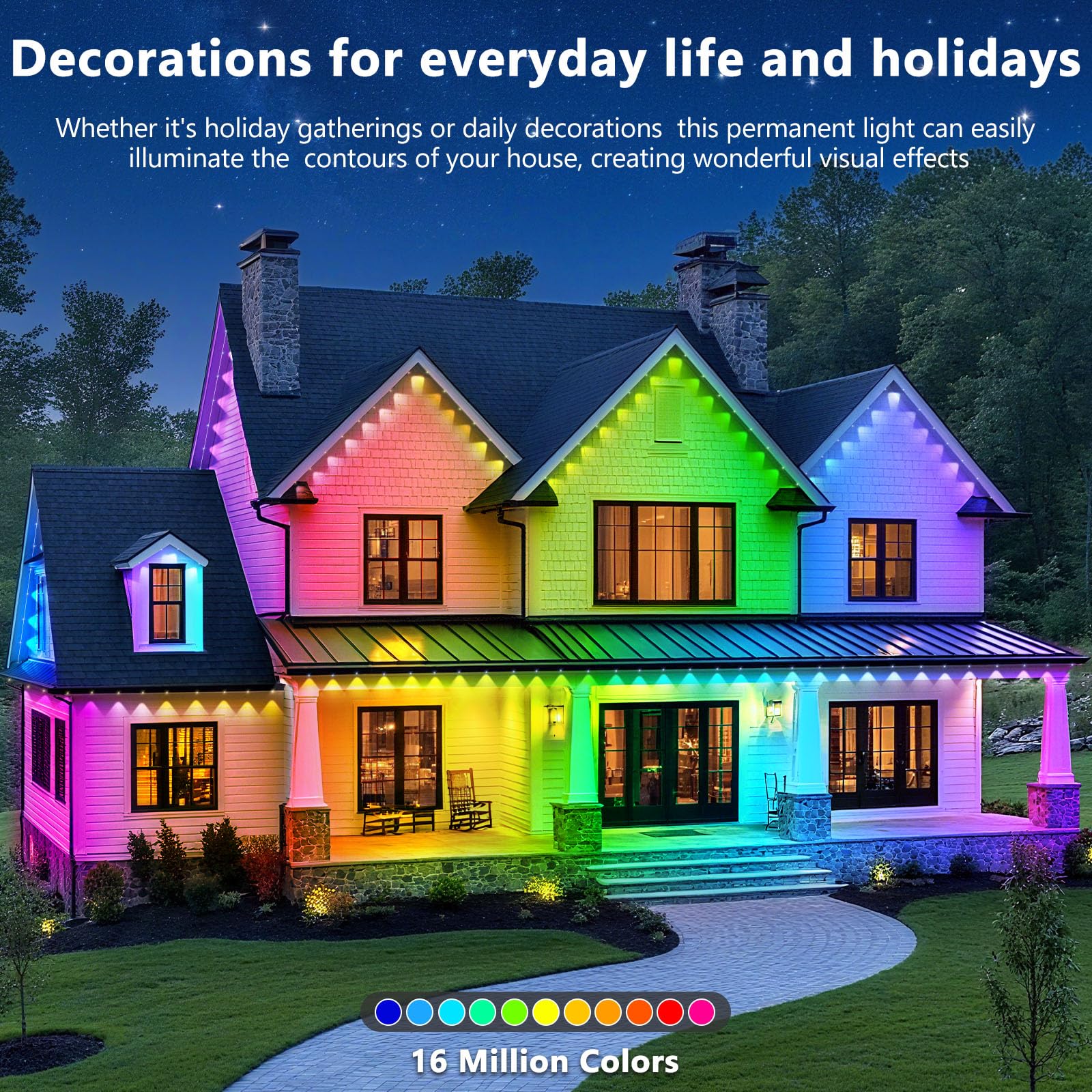 - Enhanced RGB Lighting: Our versatile fixtures cater not only to holiday embellishments but also to daily and accent lighting requirements. The gentle RGB glow effortlessly brightens your outdoor area, fostering a cozy and welcoming atmosphere for any occasion. Whether you're hosting a family get-together, enjoying quality time with friends, or seeking a tranquil moment alone, our lights provide the perfect ambiance to complement every moment, day or night.