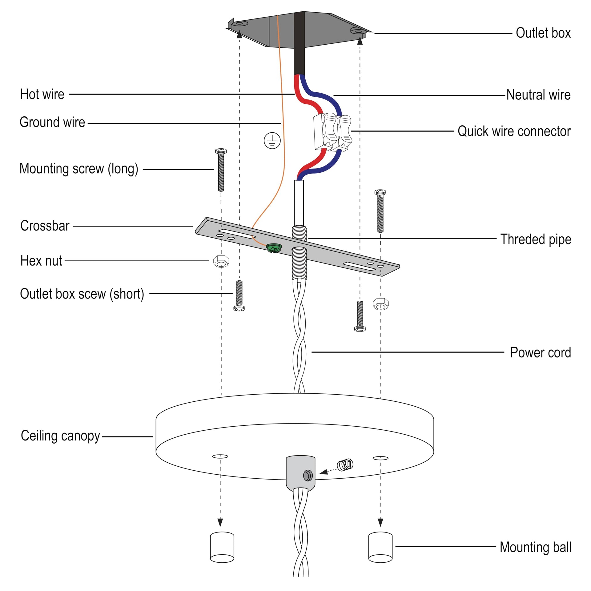 - 【Canopy Kit】 - Including 5-1/8 inch canopy, crossbar, mounting screws, threaded rod, matching loop, ground wire and quick link.