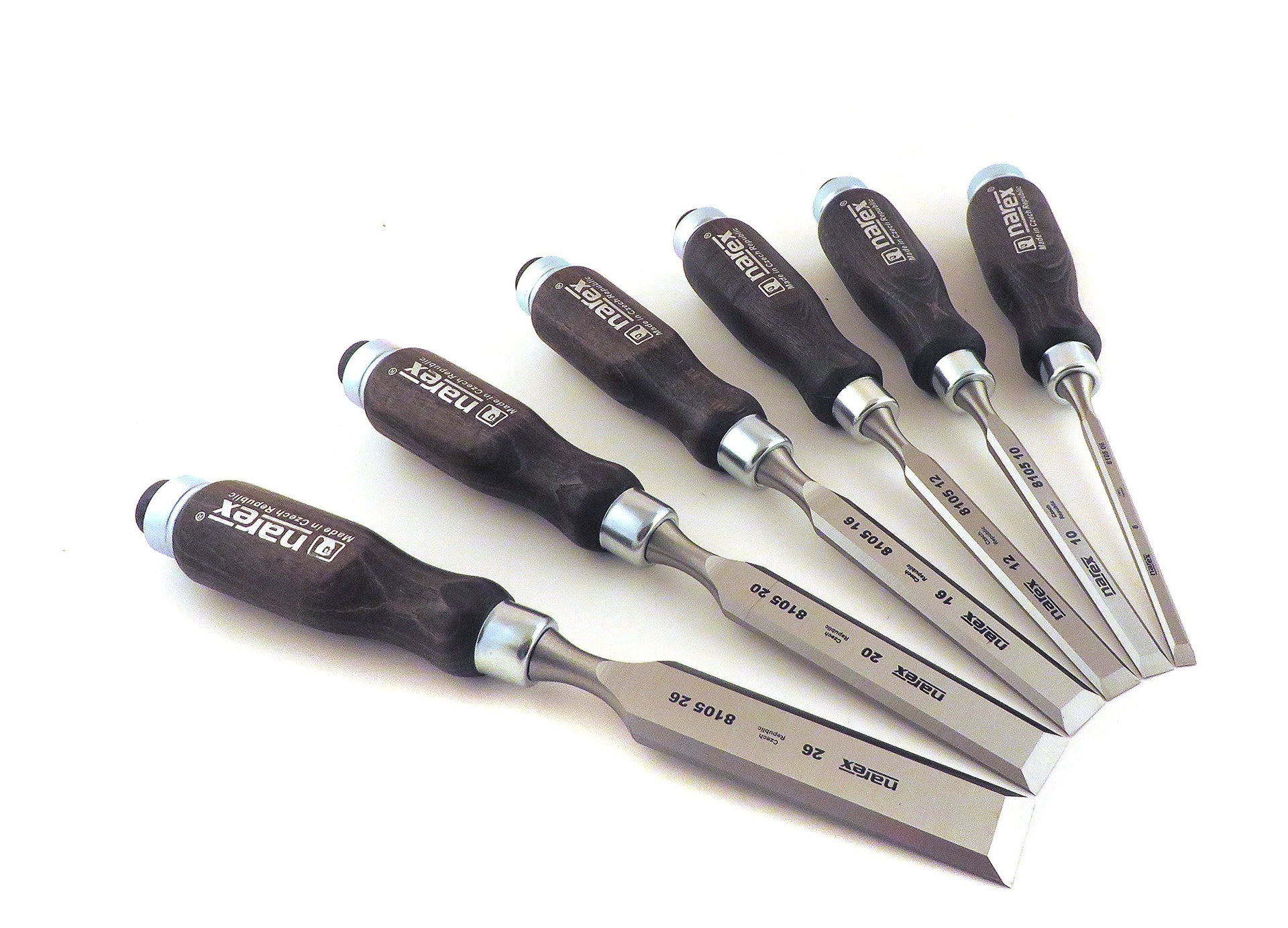 Details: These chisels are made by a Narex highly respected tool manufacturer in the Czech Republic and are of exceptional quality. The blades are made from fine-grained, nicely tempered chrome-manganese steel and hardened to Rc 59. The blades take and hold an excellent edge. The blades are accurately ground and have a slimmer cross section that woodworkers prefer. As with all edge tool, they'll need final sharpening before use. These chisels are an excellent value in a good quality tool. This is a 6 piece set that contains the following sizes: 6 mm (1/4), 10 mm (3/8) 12 mm (1/2), 16 mm (5/8) 20 mm (13/16) and 26 mm (1 1/32). They are ground at a 25 degree bevel. Blades are 4 3/4 inch to 5 1/2 inch long. Handles are black stained and lacquered European Beech are 5 1/2” long. Overall sizes range in length from 10 1/ inch to 11 inches. Blades have well-seated heavy steel tangs and handles have 2 ferrules to withstand vigorous mallet work. They come in wooden presentation box.