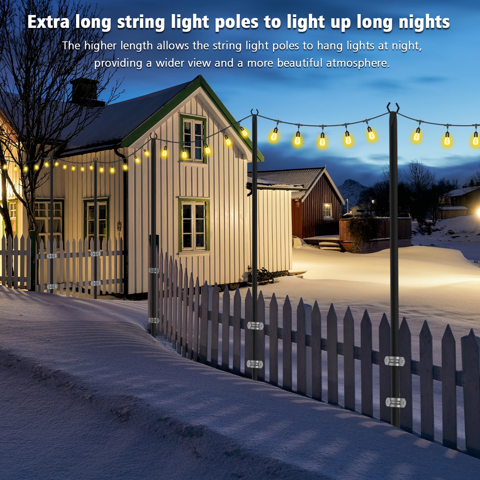 - STURDY AND DURABLE: outdoor string light poles are made of high quality materials that can withstand all kinds of wind and rain to ensure durability. The sturdy construction ensures stability, even in windy conditions. Rest assured that your lights will stay firmly in place, allowing you to enjoy your outdoor lighting worry-free.