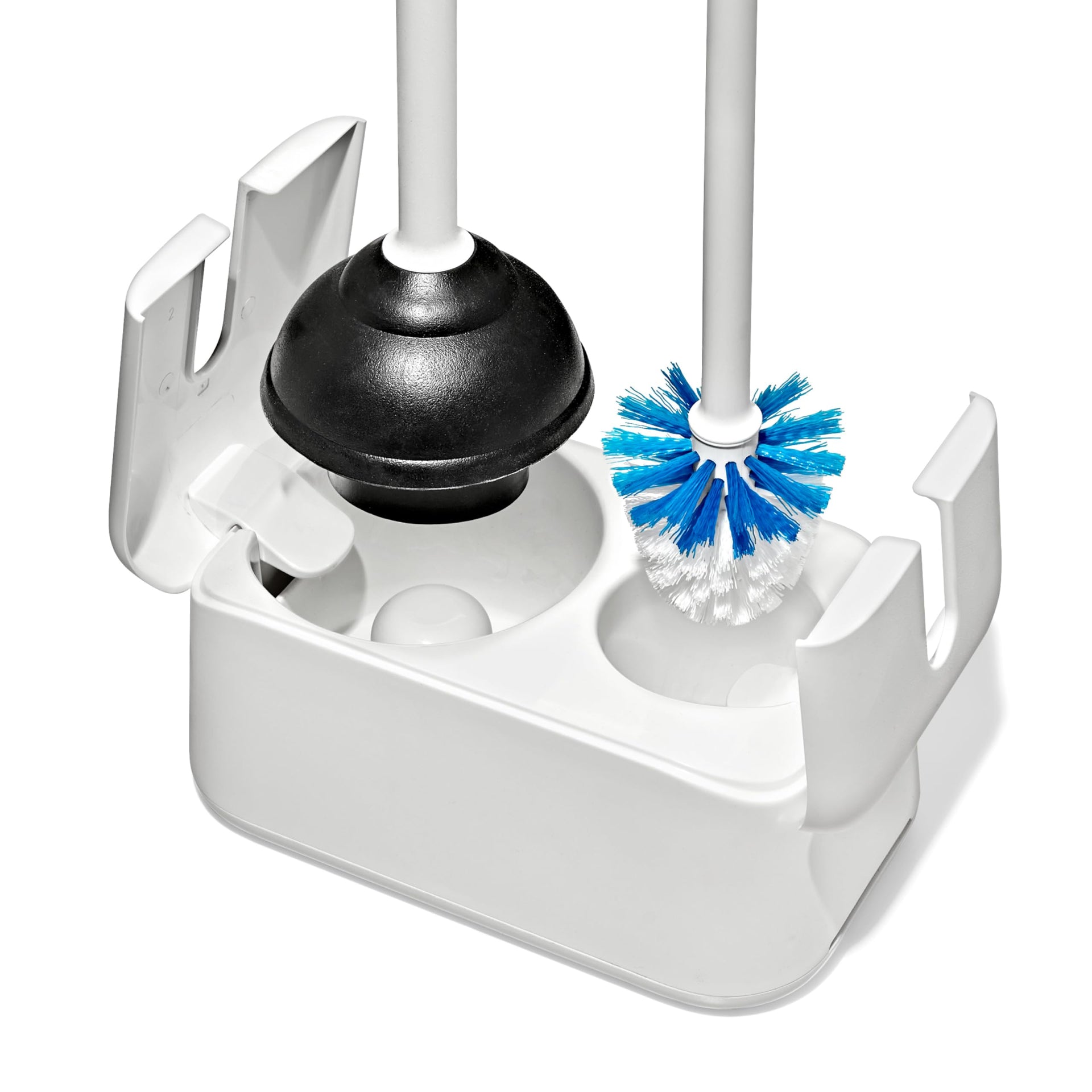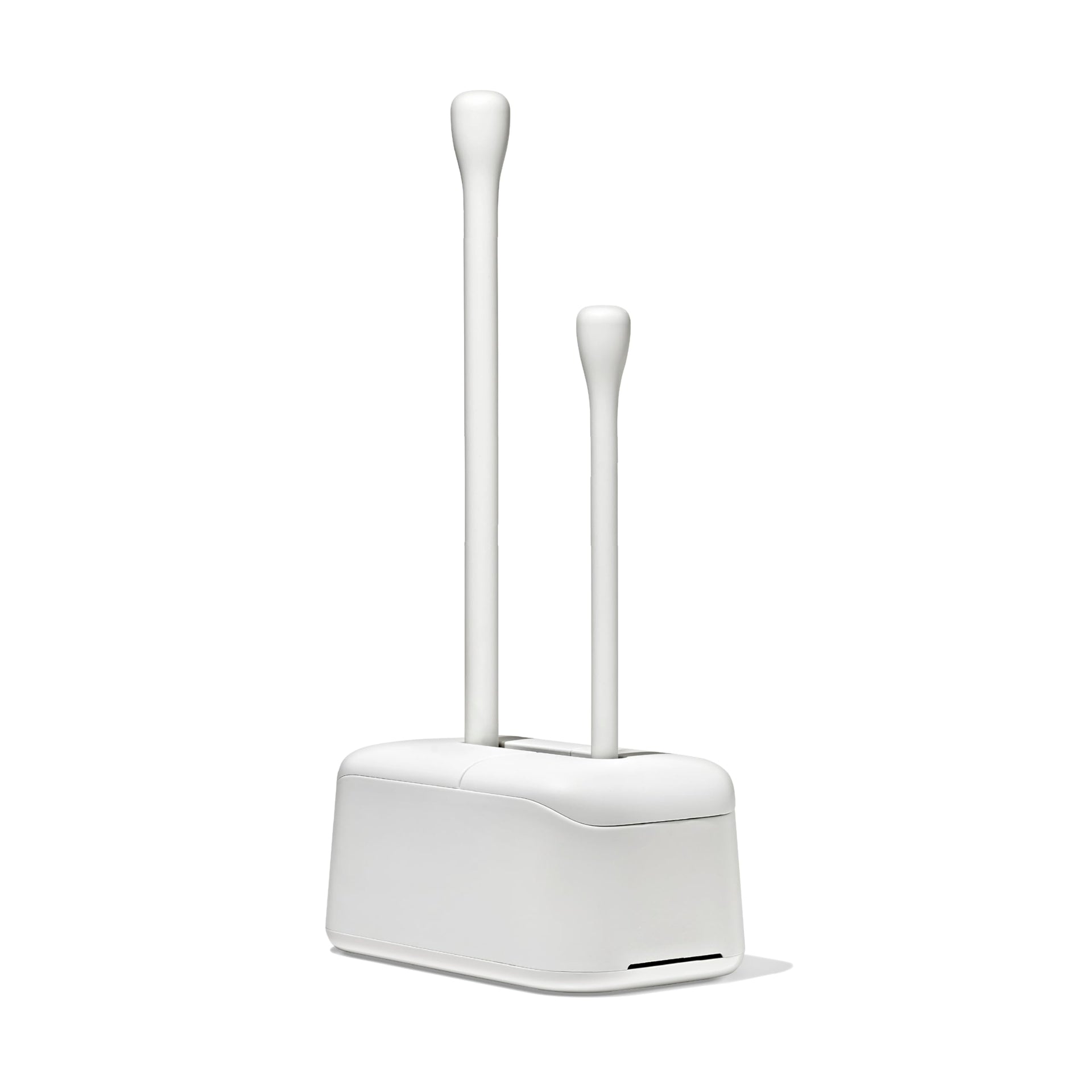 Details: Store two bathroom essentials in one convenient spot with the OXO Good Grips Toilet Brush & Plunger Combo Set. A toilet bowl cleaning brush and a plunger are essential for every bathroom – but who wants to look at them? With the stylish, space-saving canister these supplies are handy but hidden in plain sight. The space-saving canister has a compact footprint which fits perfectly in any bathroom, especially in smaller bathrooms. Add one of these sets to every bathroom in your home. When you’re ready to clean, grab the brush or plunger from the canister. The canister doors pop open when the plunger or brush is removed and stay open until you’re ready to put away the plunger or brush. Drainage holes are underneath the brush storage area to catch stray drips, and the side of the canister has ventilation holes to keep things fresh. The toilet brush has been carefully designed to deep clean hard-to-reach spaces. It features a bullet-shaped bristle configuration that accommodates even low-flush toilets, and the stiff upper bristles are perfect for cleaning under the rim. Replacement toilet brush heads are available – replace the brush head with a simple twist. Comfortable, contoured handles on both the brush and plunger provide a steady grip during use. The egg-shaped handles have an oval cross-section that prevents them from spinning in your hand.