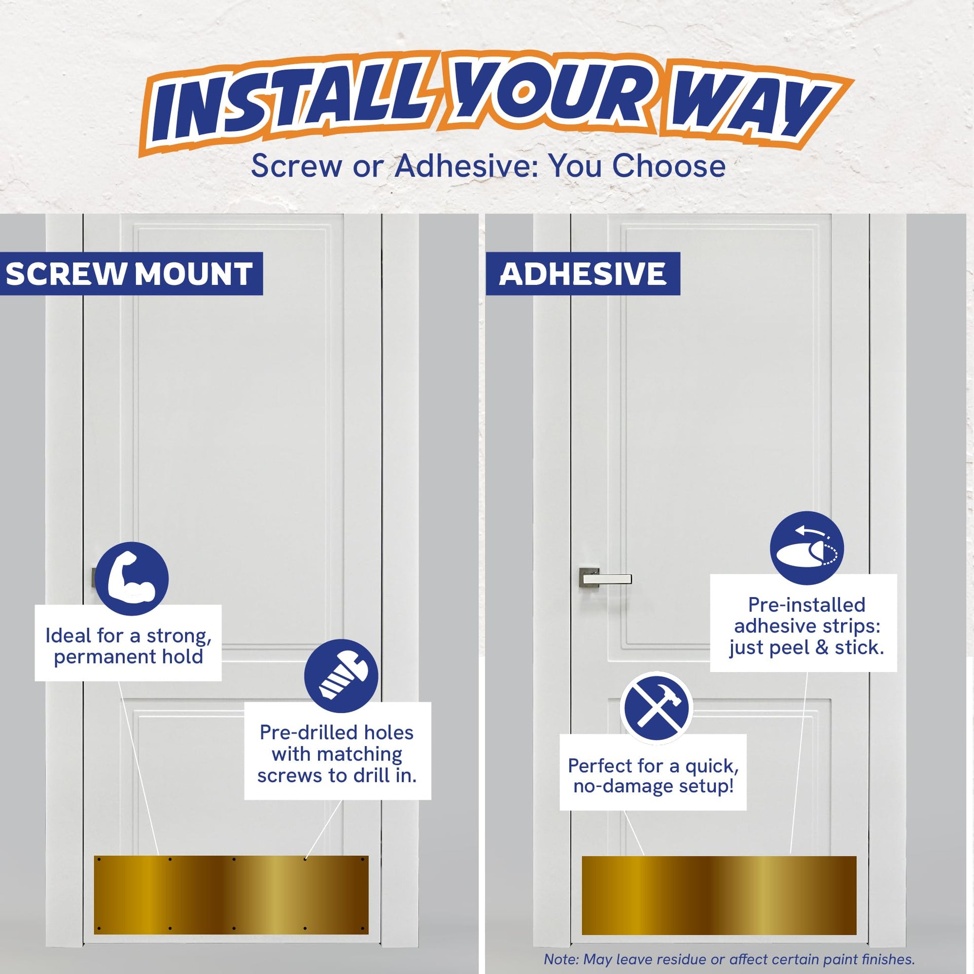 - 2 WAY INSTALLATION — Enjoy the flexibility of installing with 8 pre-drilled holes and color-matching screws, or use the optional double-sided adhesive for a quick and hassle-free setup.