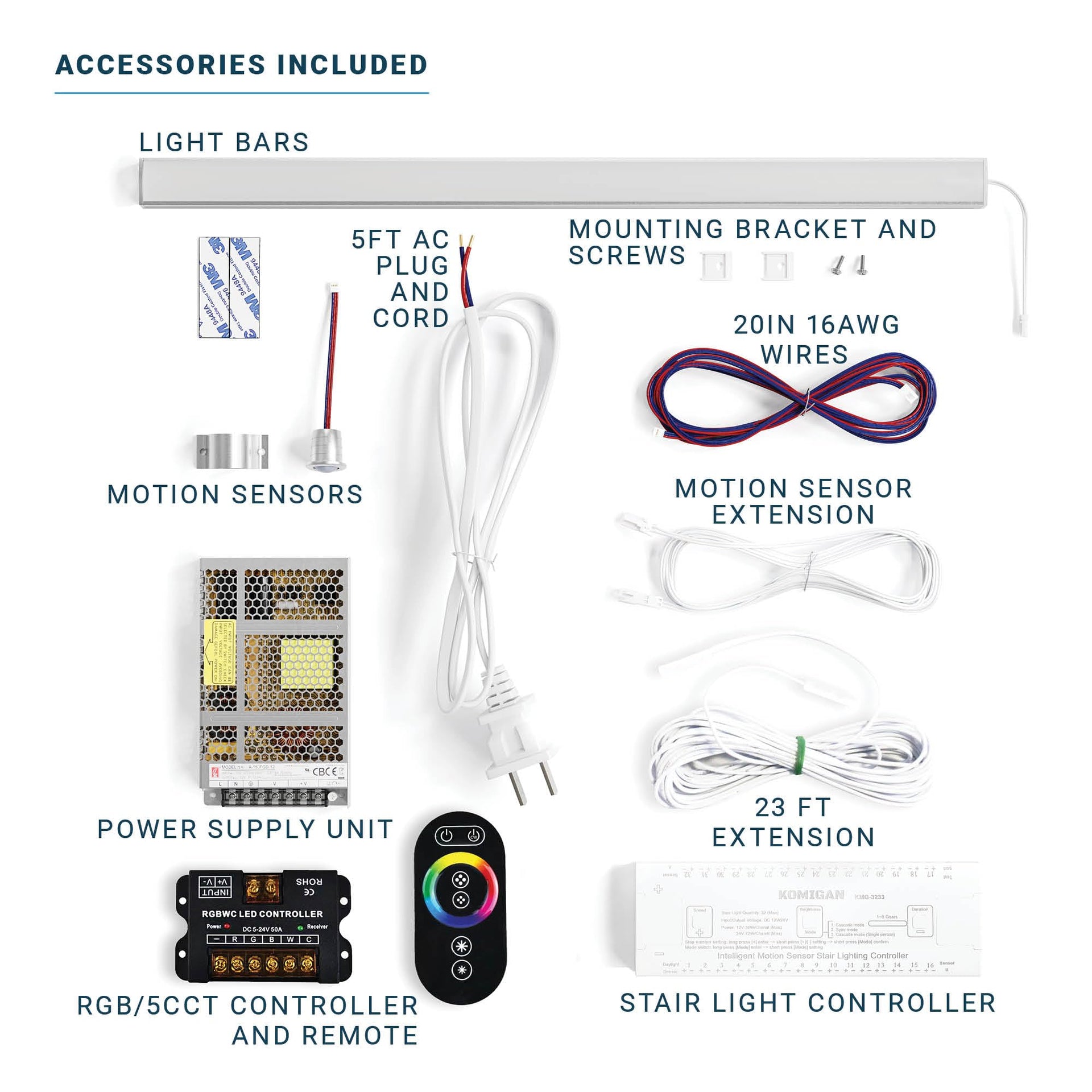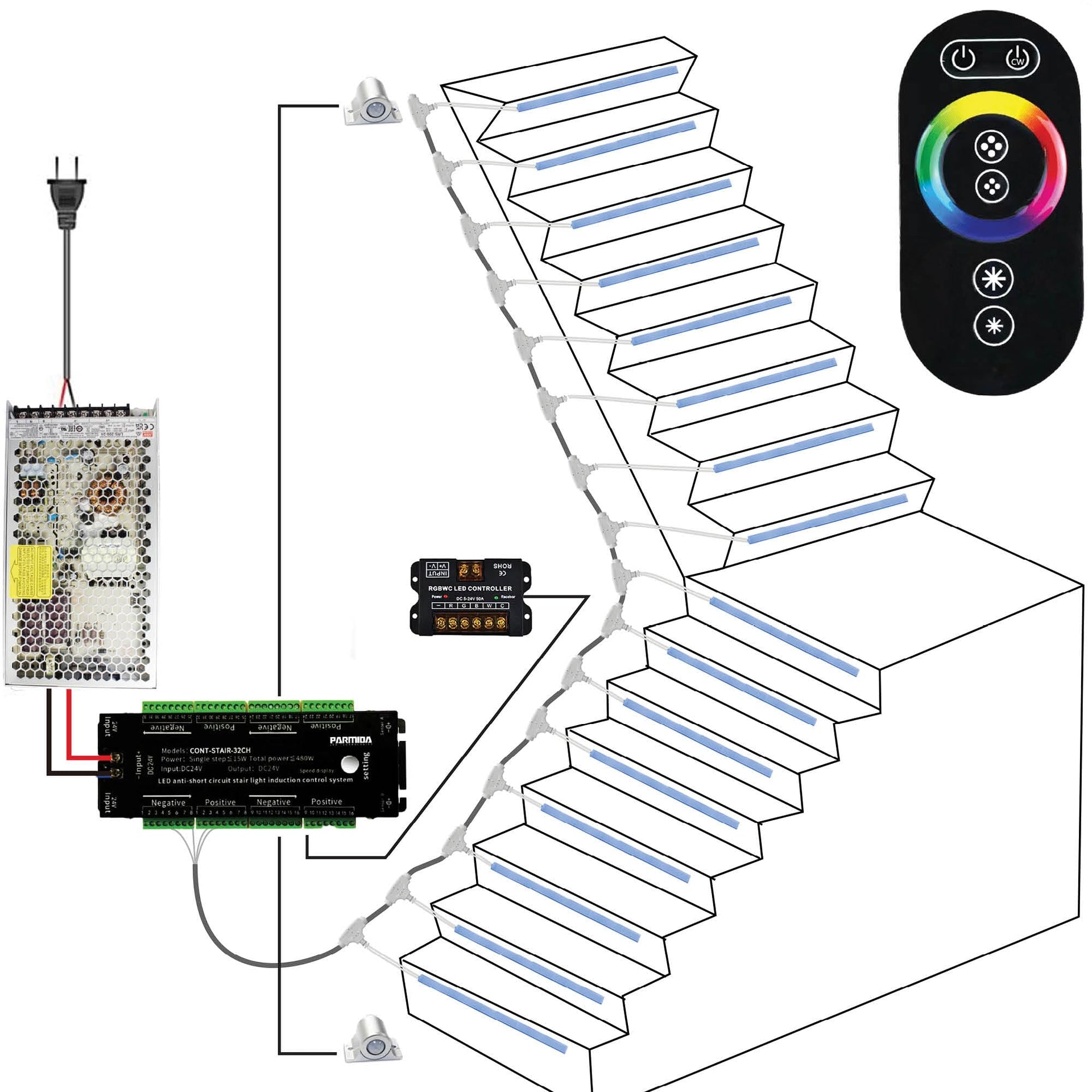- ALL INSTALLATION ACCESSORIES INCLUDED: This indoor Stair Light Kit comes with everything you need! Lengthy extension cords, stair light controller, mounting accessories and an easy to use remote control allows for easy adjustmens to dimming, color, and other lighting effects such as jump and fade. With the RGB and 5CCT features, any color option is available at the click of a button.