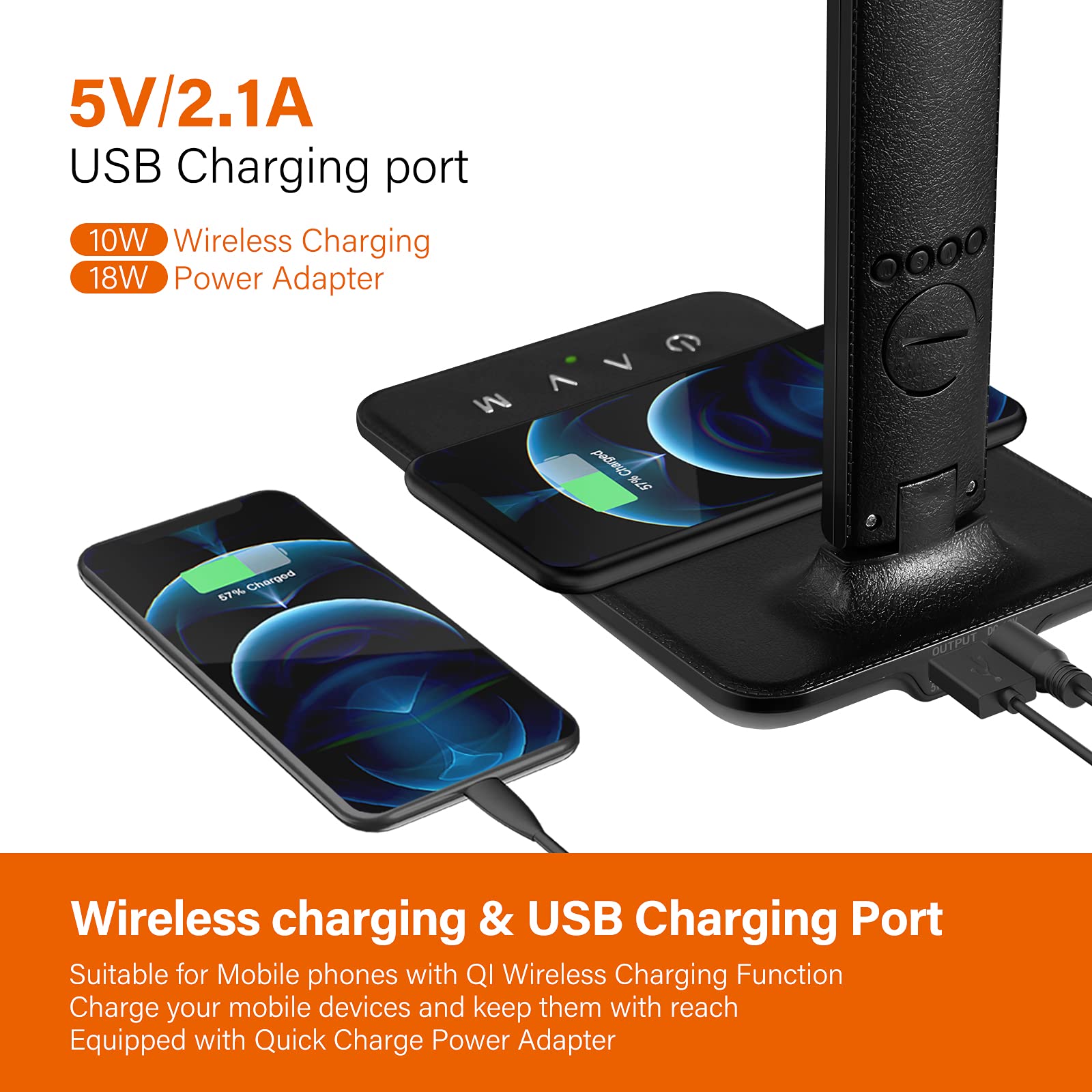 - POWERFUL CHARGING: Owning both USB charging port and fast wireless charger (needs 5V/2A adapter, already Included) Which means you can charge two devices and use the desk lamp to work at the same time.