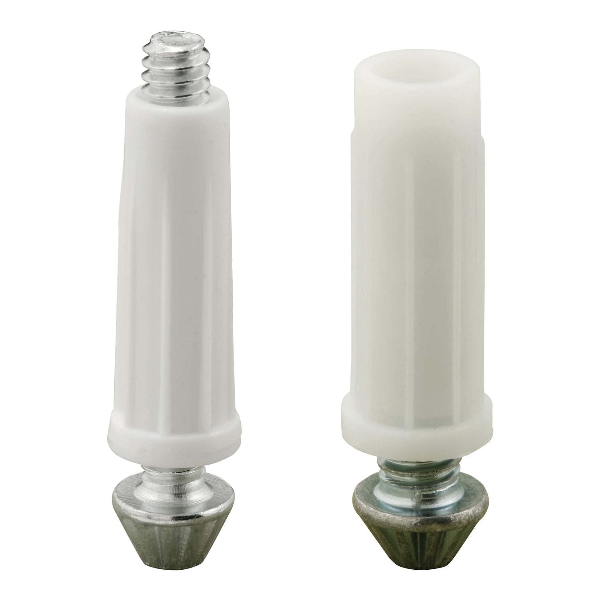 Details: These bi-fold door bottom pivots are constructed of plastic bases and steel pivot screws. This kit includes a pair of 3/8 inch diameter bases and a pair of 7/16 inch diameter bases. These height-adjustable bases install beneath the pivoting vertical style of bi-fold doors and lock into pivot brackets that fasten to the jamb and/or floor. Each pivot screw head features a grooved cone-shaped pivot head, and it screws in or out of the plastic base for adjustment. These pivots are easy to install and they are used by a variety of bi-fold door manufacturers.