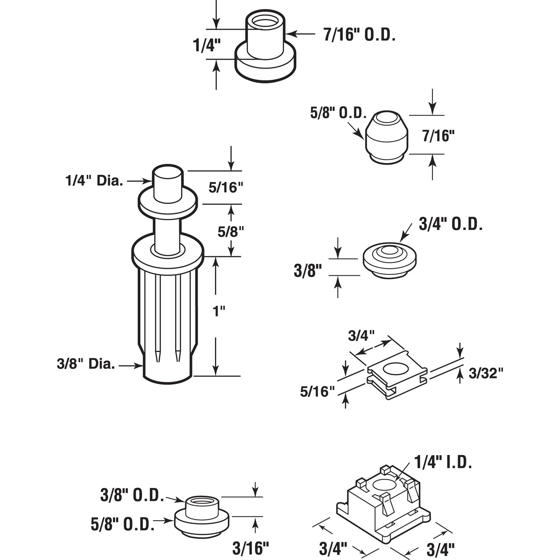 Details: This bi-fold door top pivot and cap repair kit is constructed of a steel pin with an assortment of seven different types of caps. If the shape and size of the bi-fold top pivot caps are unknown, this is the ideal repair kit with its variety of replacement parts. The plastic base of the pivots included in this kit have a 3/8 inch diameter and require a 3/8 inch hole in which to insert. The parts included in this kit are used on bi-fold doors manufactured by Alliance and a variety of others. All caps are constructed of plastic and have an inside diameter of 1/4 inch