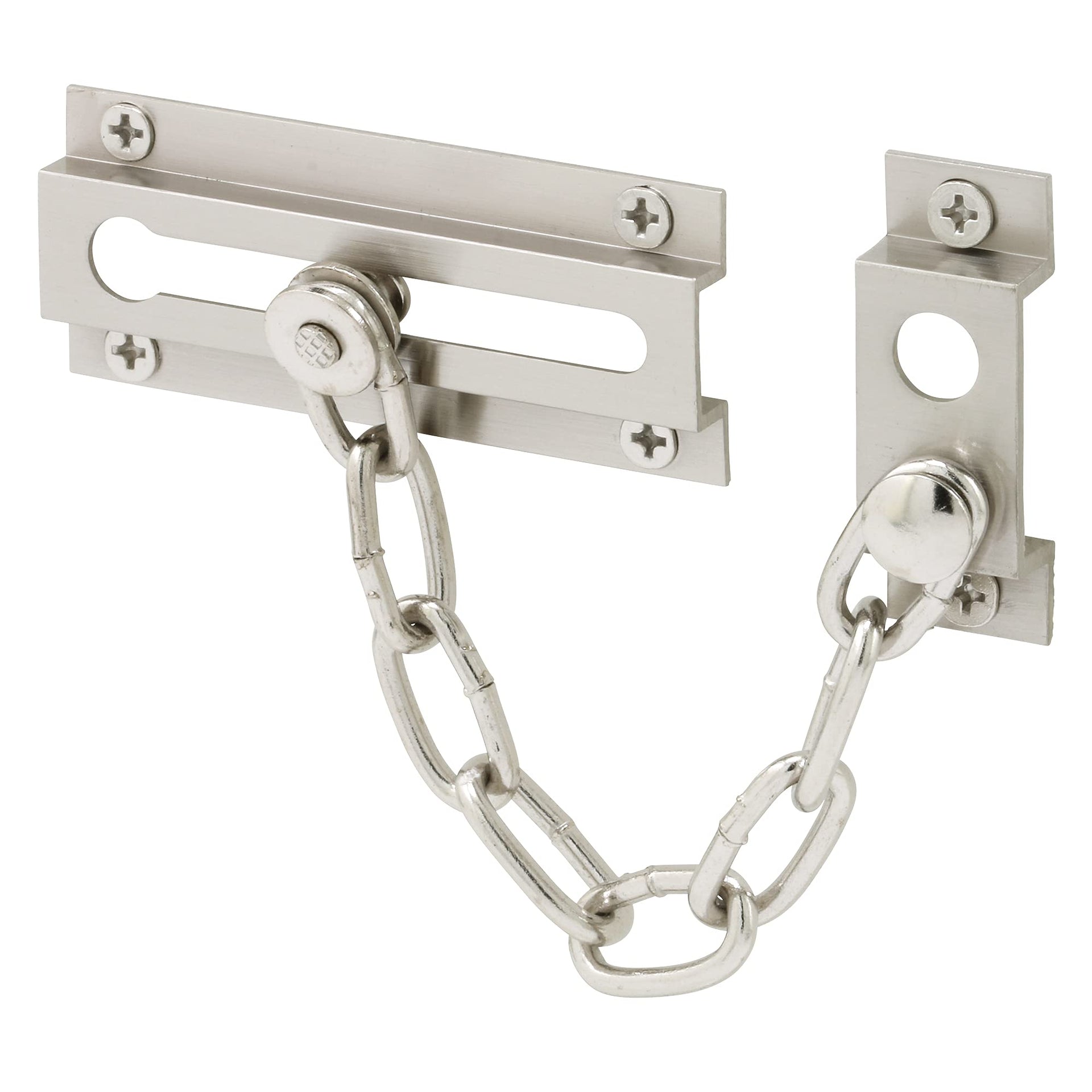 - DURABLE CONSTRUCTION – This chain door guard is constructed of extruded brass with a satin nickel plated finish and a 6 inch, 8-link welded steel chain It’s strong and durable and sure to last.