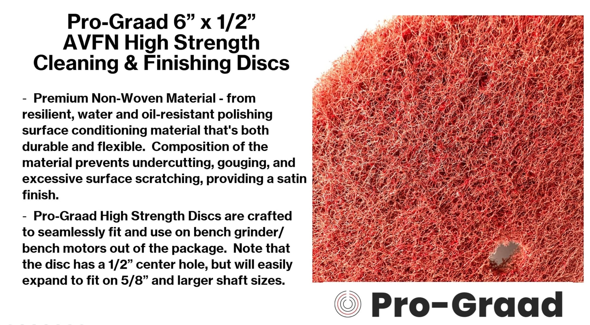 - [IN THE BOX]: 4 each Pro-Graad PG-27747 6” Diameter x 3/8” Thick x 1/2” Hole Aluminum Oxide Very Fine (AVFN) High Strength Non-Woven Buffing, Blending, Cleaning, Light Deburring & Finishing Discs