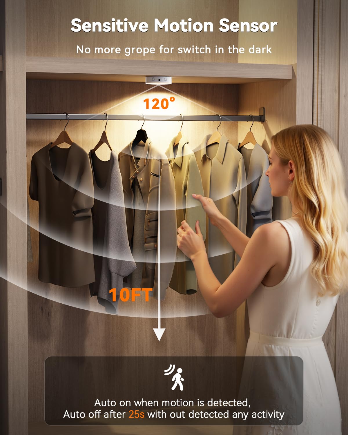 - 1500mAh Rechargeable Battery & Upgrade Fast Charging: These cabinet lighting wireless built in 1500mAh rechargeable batteries and a 2 in 1 charging cable. The motion sensor lights indoor can be fully charged within 3-4 hours. Once fully charged, it can provide 10 hours of continuous use in the Always on mode (100% brightness). In the motion sensor mode, it can be used for approximately 50-70 days. Good for renters, campers, RV owners,eco-friendly lighting.
