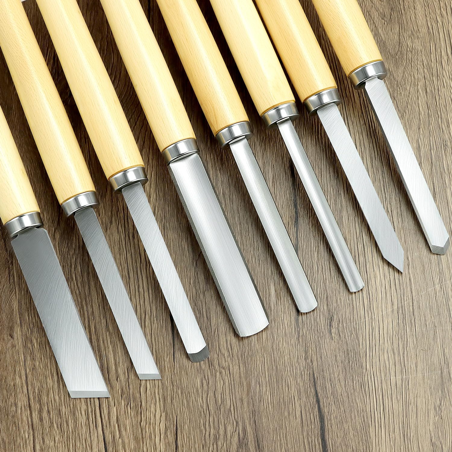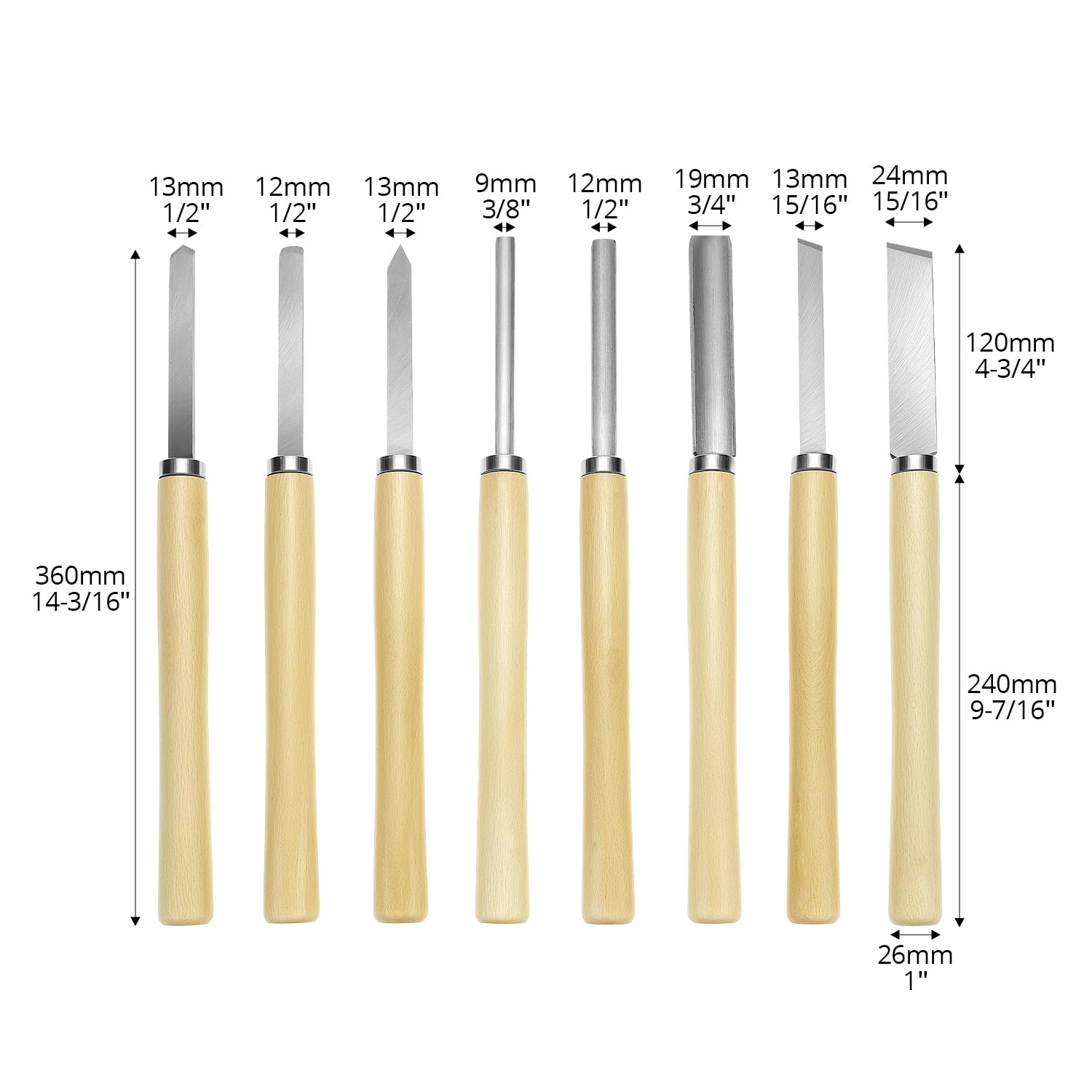 - Comprehensive Set for Versatile Use: Includes 8 essential chisels: 2 Skew Chisels (1" and 1/2"), 1 Spear Point Chisel (1/2"), 1 Parting Tool (1/8"), 1 Round Nose Chisel (1/2"), and 3 Gouge Tools (1/4", 1/2", 3/4") for diverse woodworking projects.