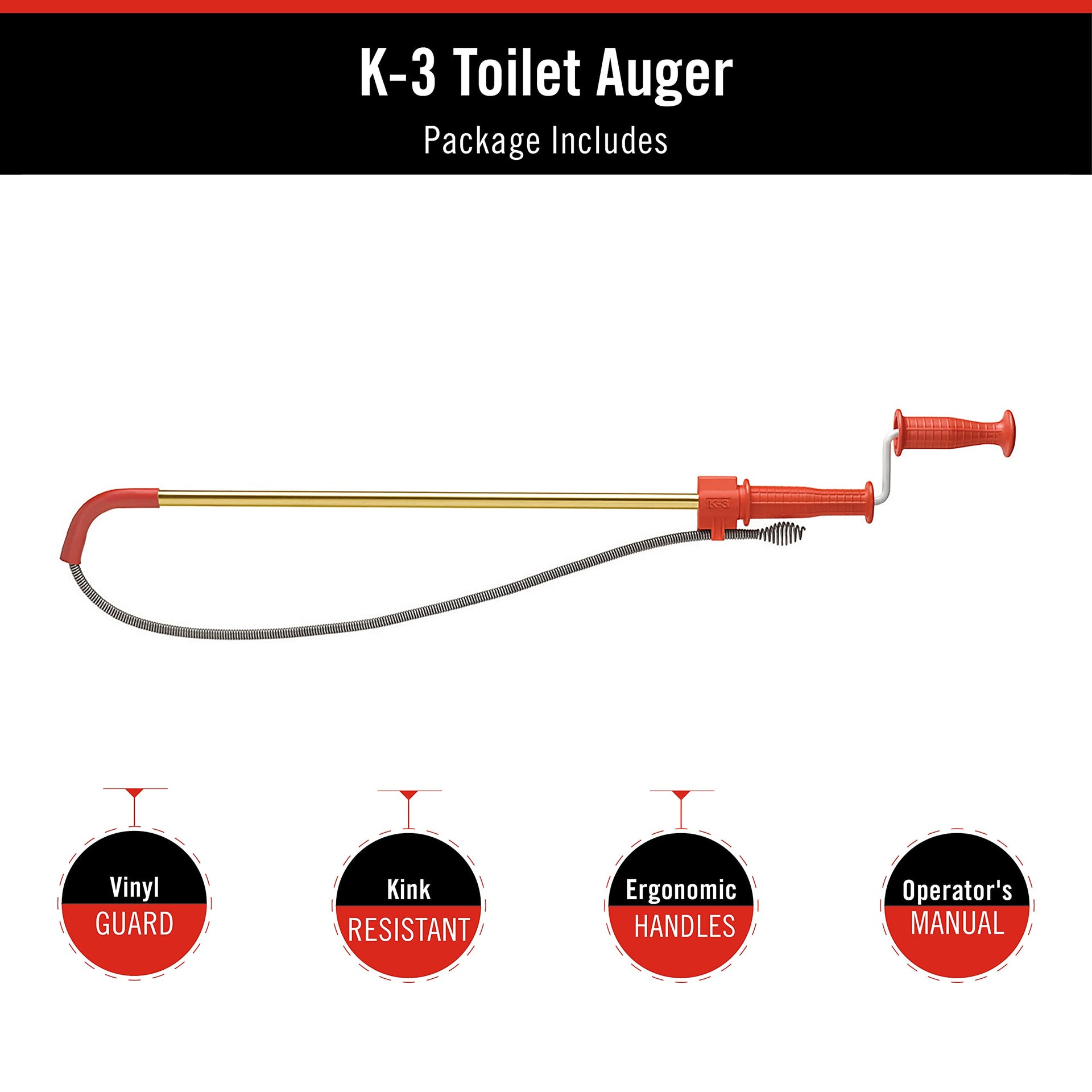 RIDGID 59787 Model K-3 Toilet Auger with Unclogging 3-Foot Snake and Bulb Head