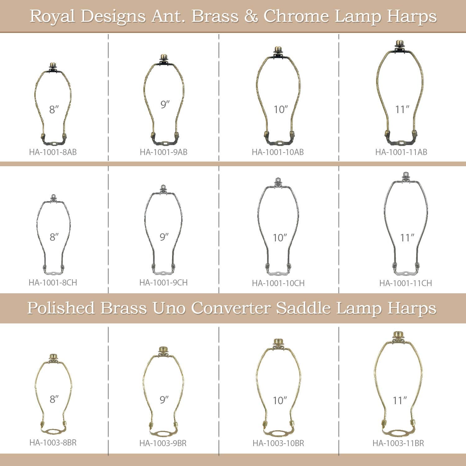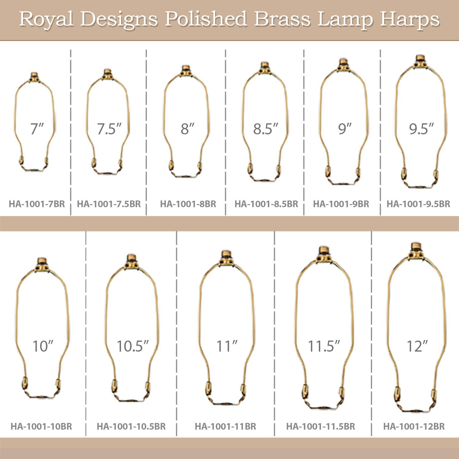 Details: The Royal Designs, Inc. 11-inch Heavy Duty Harp in Polished Brass is a reliable and stylish solution for replacing or upgrading your lamp shade support. Made from high-quality metal, this lamp harp features a heavy-duty construction designed to support a wide variety of lamp shades—including modern, transitional, and traditional styles. This harp includes a matching saddle and is crafted with a durable finish to resist wear and maintain its appearance over time. The threaded top is designed to accommodate most standard finials (thread size: 1/4-27M), making it easy to personalize your lighting with a decorative touch. Whether you're restoring a vintage lamp or assembling a new lighting setup, this 11-inch harp offers the perfect fit for table lamps, floor lamps, and accent lighting. It’s compatible with spider-fitter lamp shades and allows you to adjust the lamp shade height for the ideal lighting effect. Color: Polished Brass Material: Metal Size: 11 inches Thread Size: 1/4-27M Includes: Harp and Saddle Application: For use with spider-fitter lamp shades Elevate your home lighting with the strength and quality of Royal Designs’ heavy-duty harp—designed for function, durability, and timeless appeal.