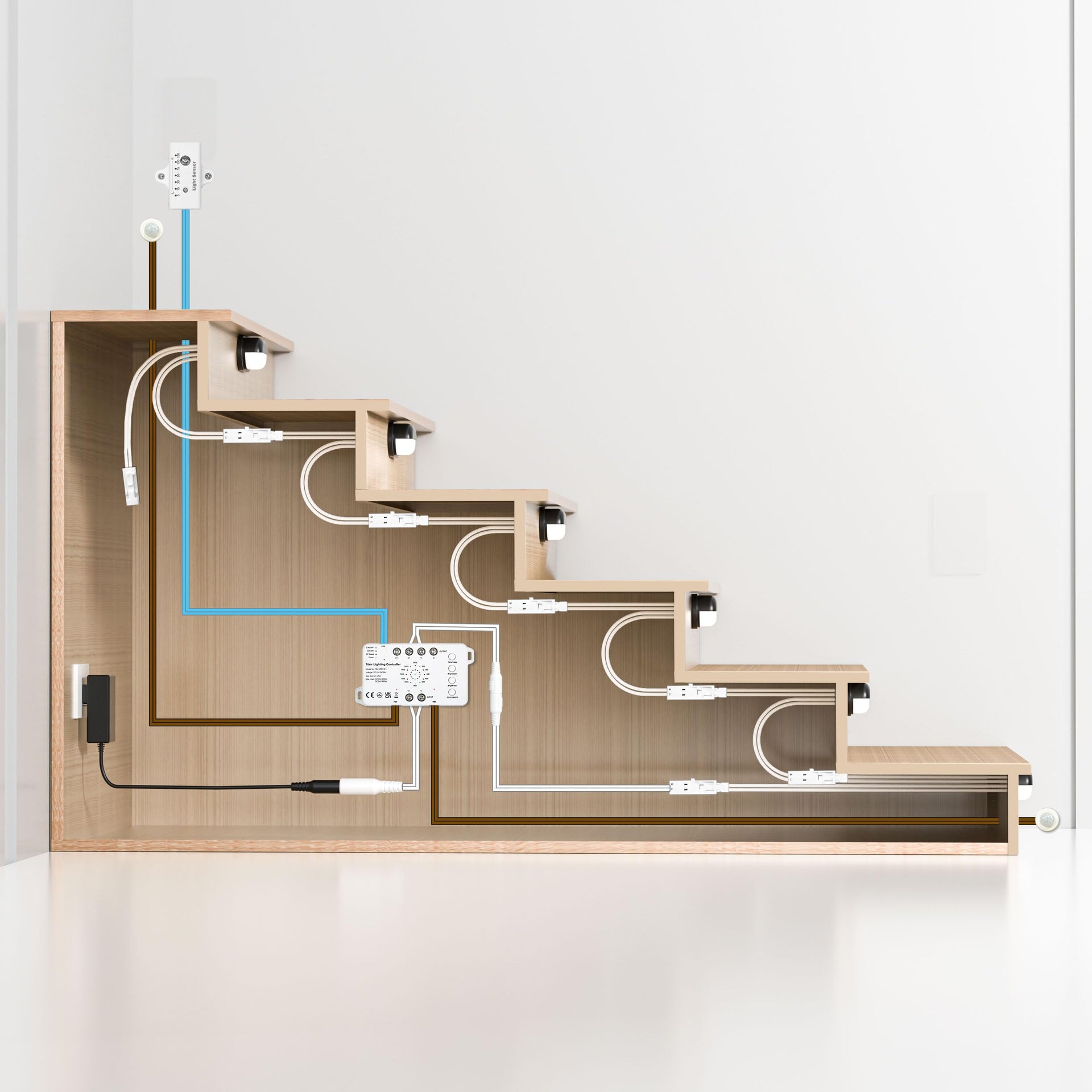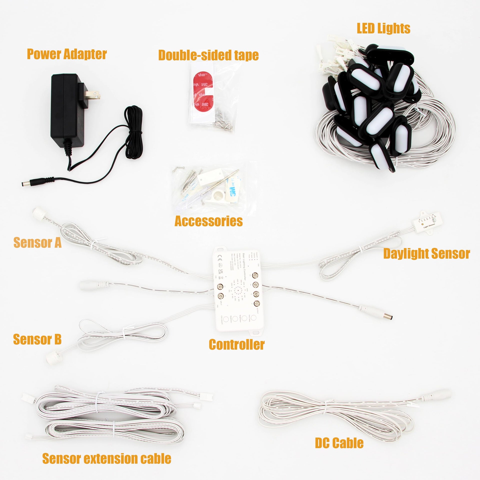 Details: RWOFNIA Motion-triggered LED Stair Lighting Kit SSL-0516-B, Dimmable Delay Lights Off Day/Night Function Suilt For Indoor Stair Lights (Warm White 3000K, 14 Stairs)