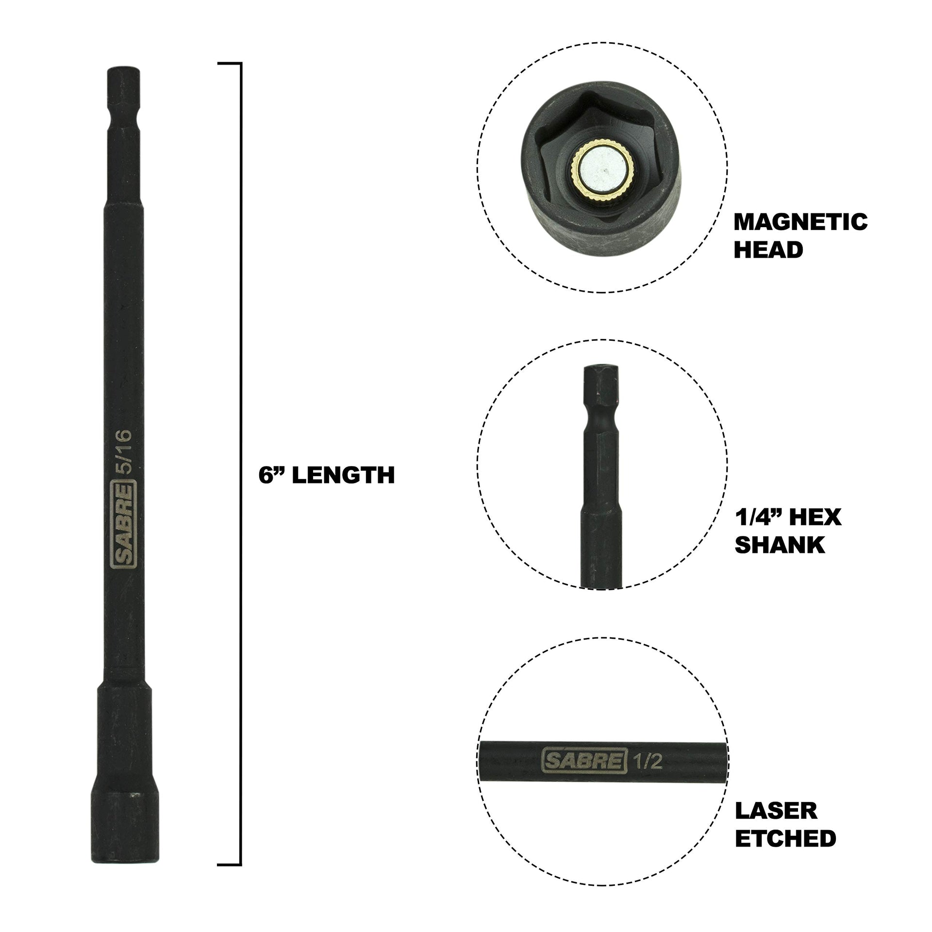 - Strength: Sabers’ 6” long magnetic nut drivers are made to last. Built for impact with chrome vanadium steel and, coated with black phosphate for long lasting rust prevention
