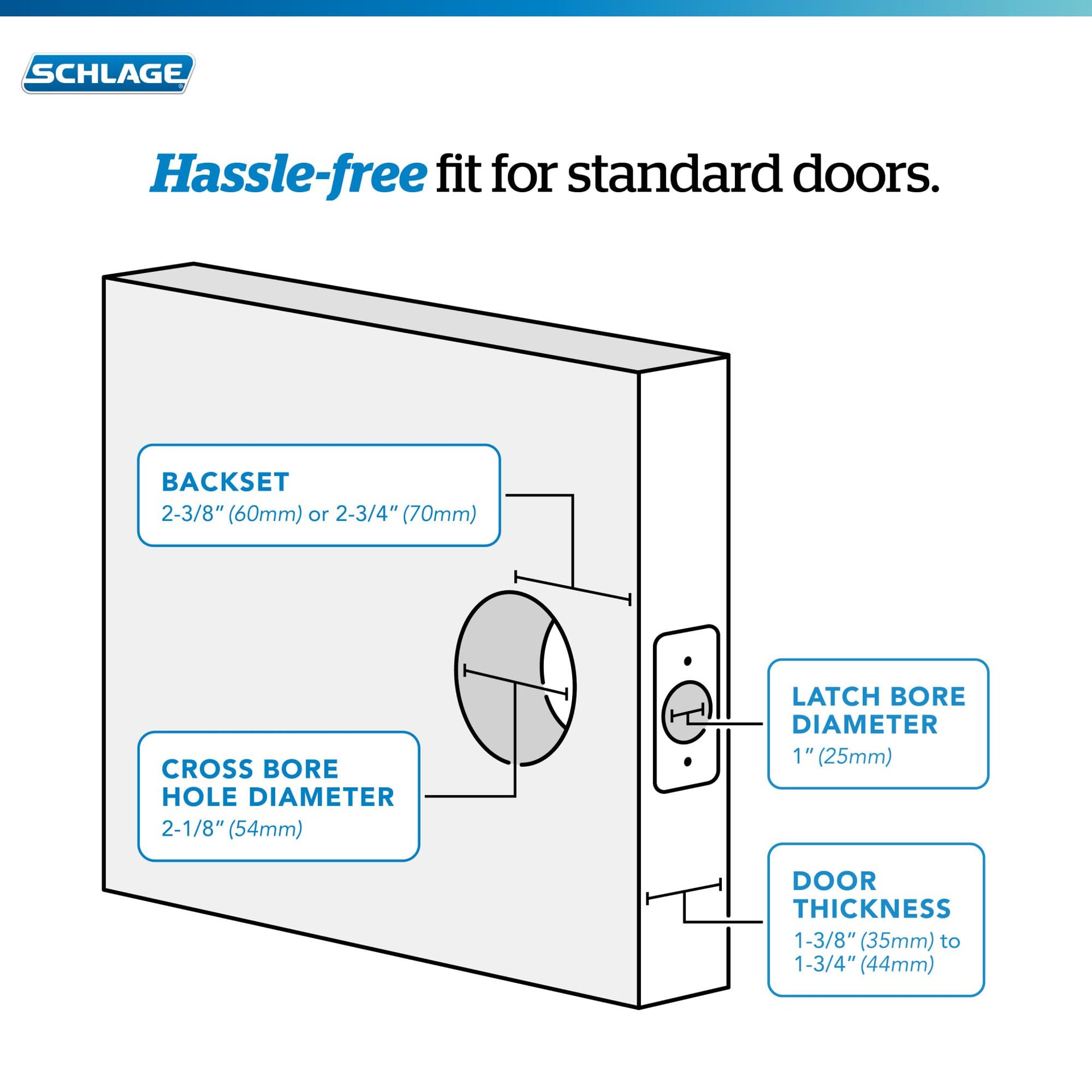 - HASSLE-FREE FIT: Universal latch slides easily into place without tools to fit standard doors with 2-3/8" or 2-3/4" backset; fits door thickness 1-3/8" to 1-3/4"; includes both radius and drive-in faceplate for flexibility