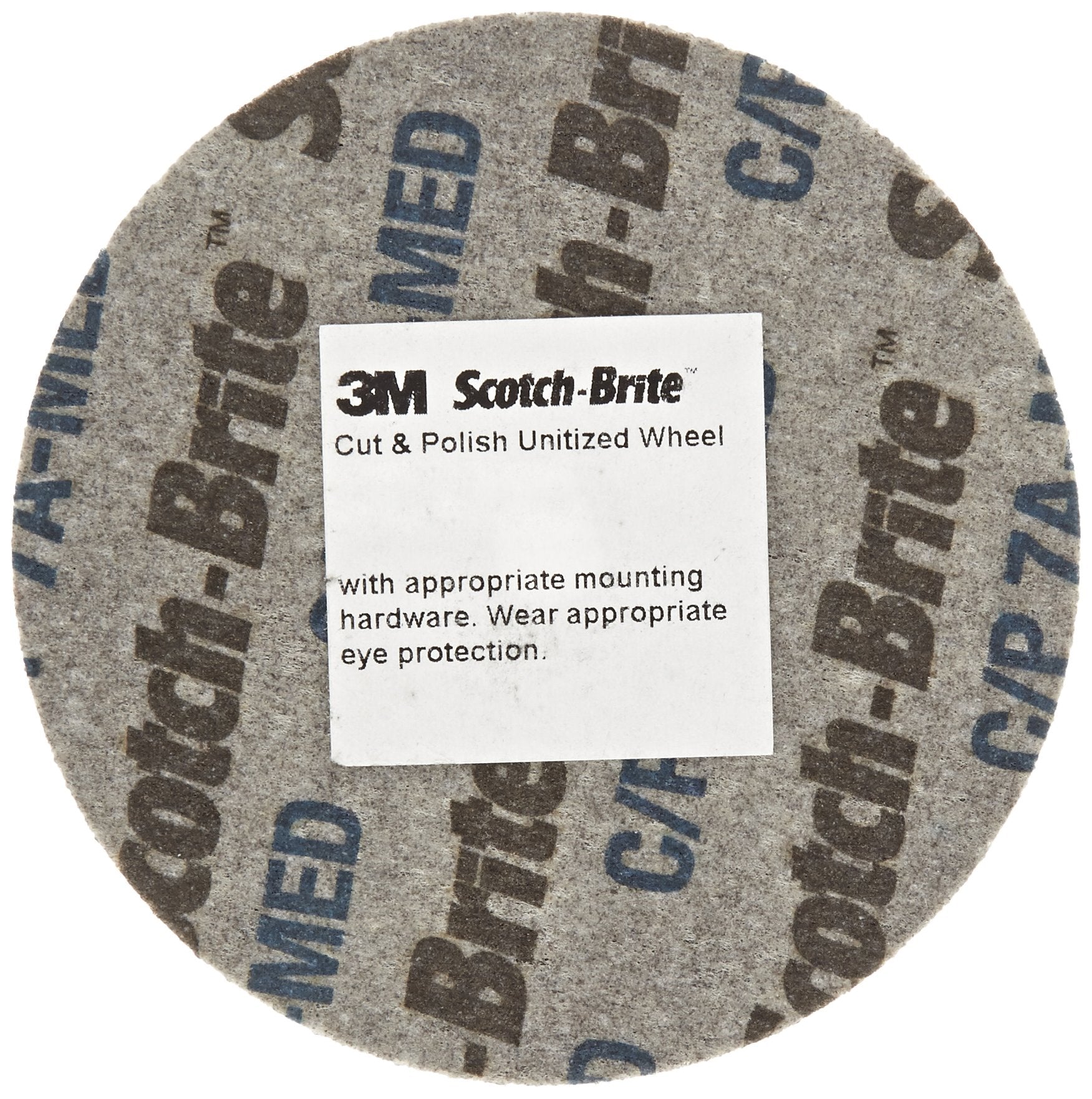 Details: 3M Scotch-Brite CP-UW unitized deburring wheel uses aluminum oxide as the abrasive material and has a diameter of 3 in. The arbor attachment allows for easy mounting to the tool or pad. In addition to the other aspects of these parts, another important component of these is the thickness. This 3M part is 1/4 in thick. All abrasive products that rotate or spin, such as the ones in this category, have a maximum speed at which you can run them. This 3M deburring wheel can be run at a maximum speed of 18100 RPMs.