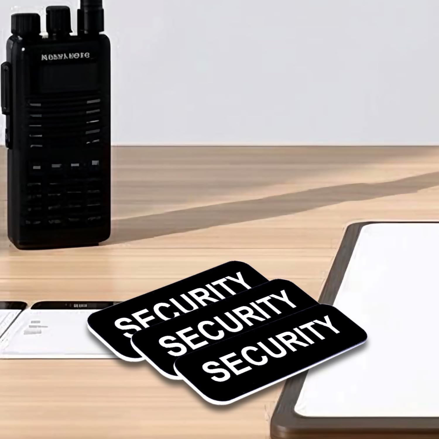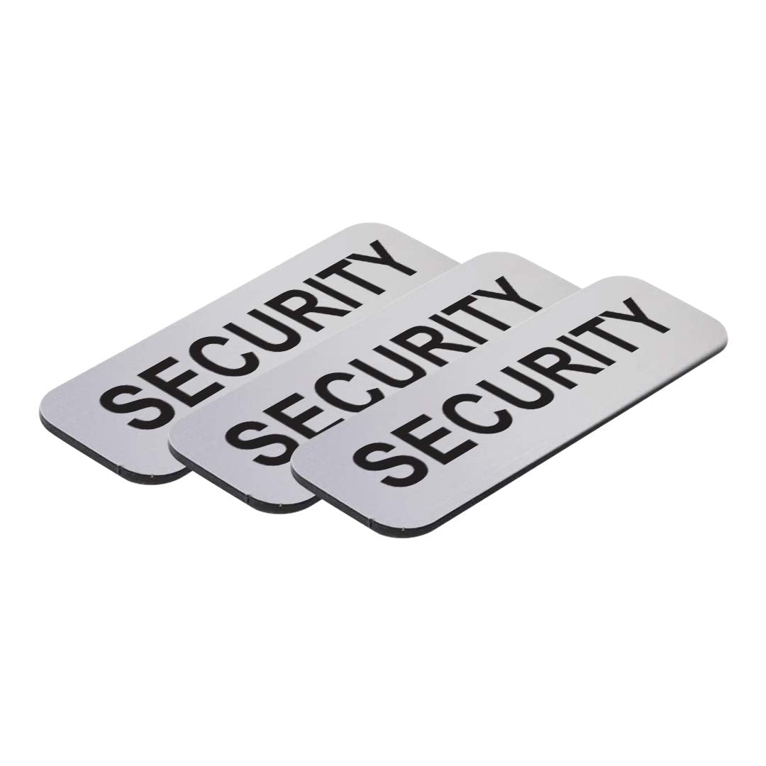 Details: Security 1 x 3" Rounded Corners Name Tag (3 Pack). Easy to attach with included fastener. Brushed Silver color with Black text.
