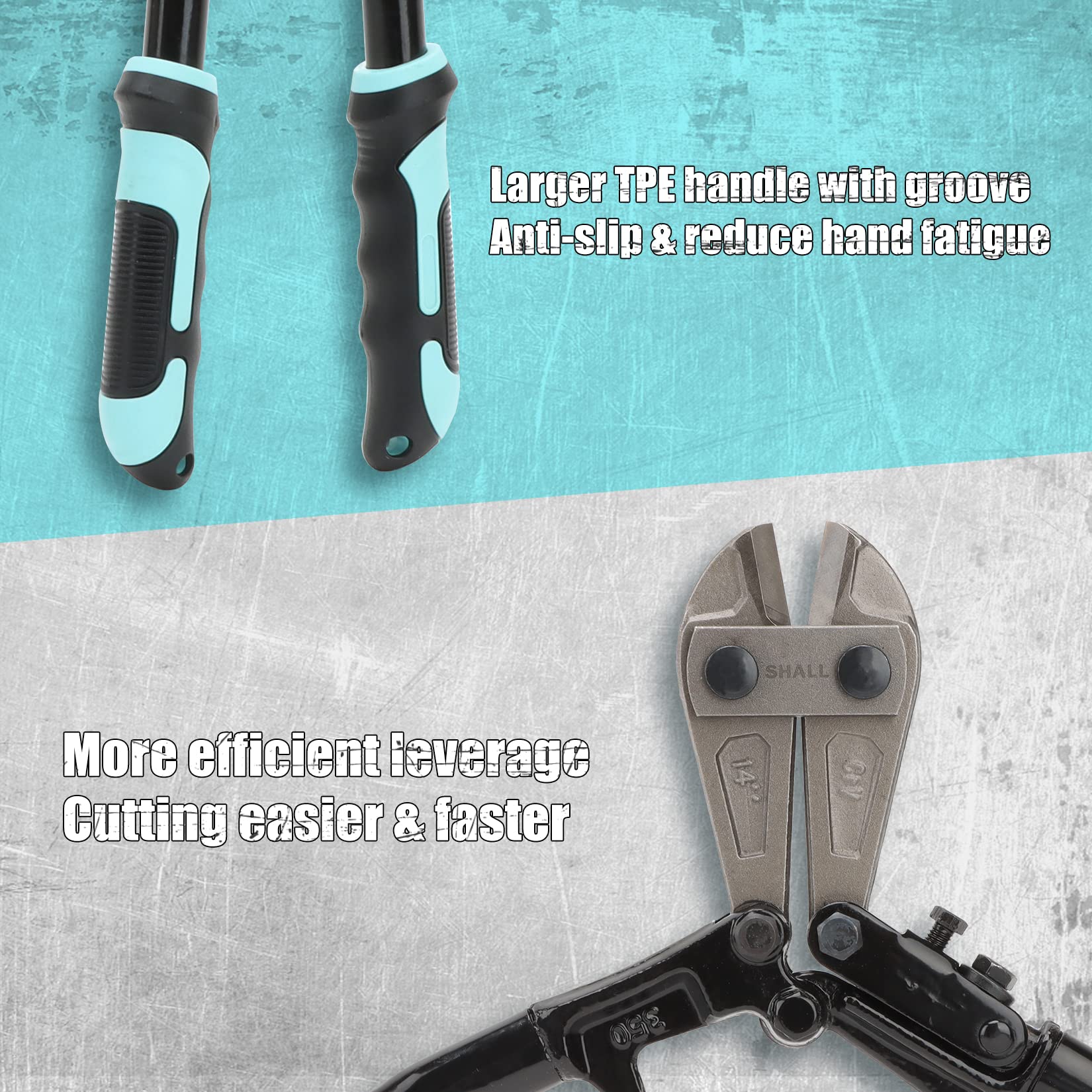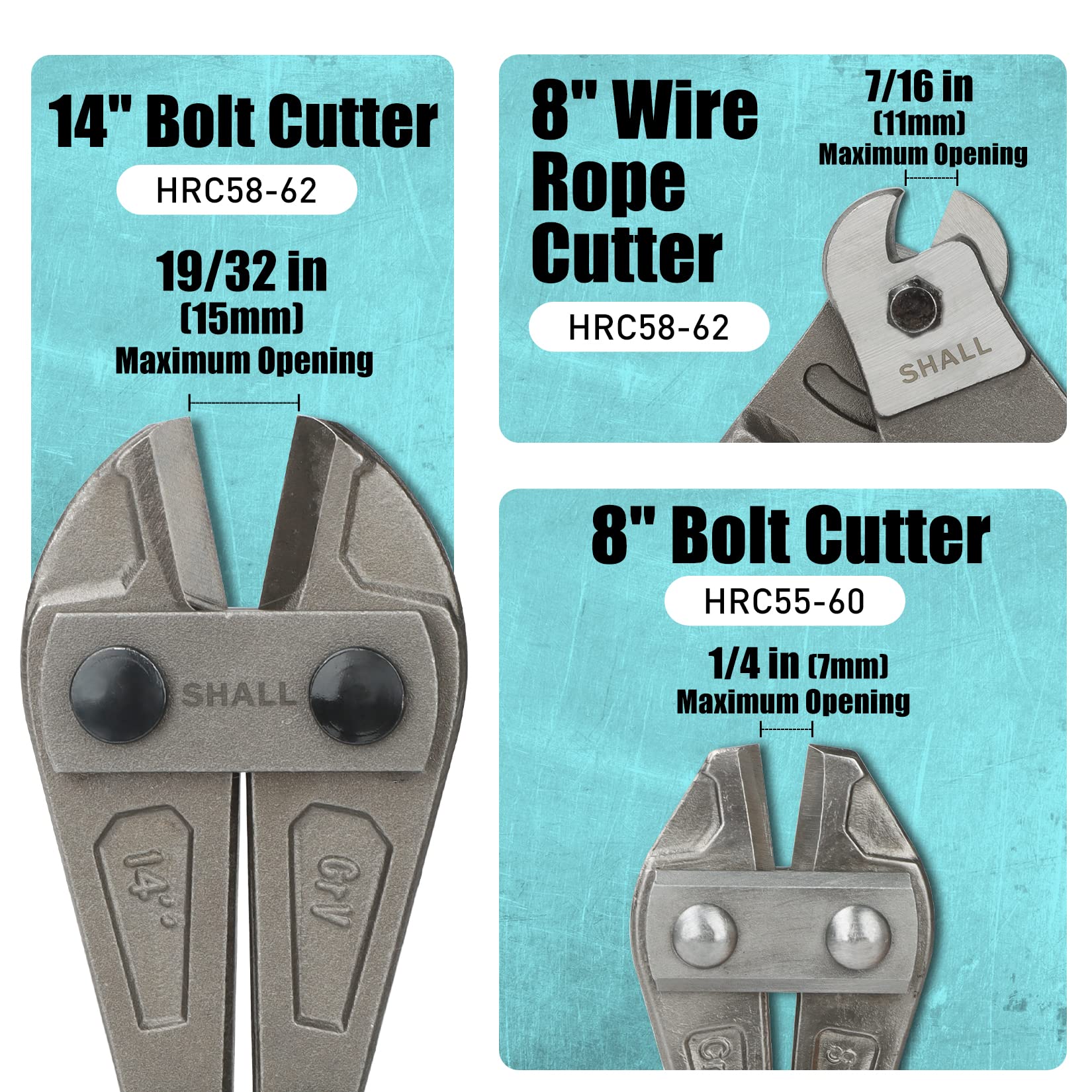 - What Included: 14” bolt cutter, max jaw opening is 19/32 in (15mm); 8” wire cutter, max jaw opening is 1/4 in (7mm); 8” wire rope cutter, max jaw opening is 7/16 in (10mm)