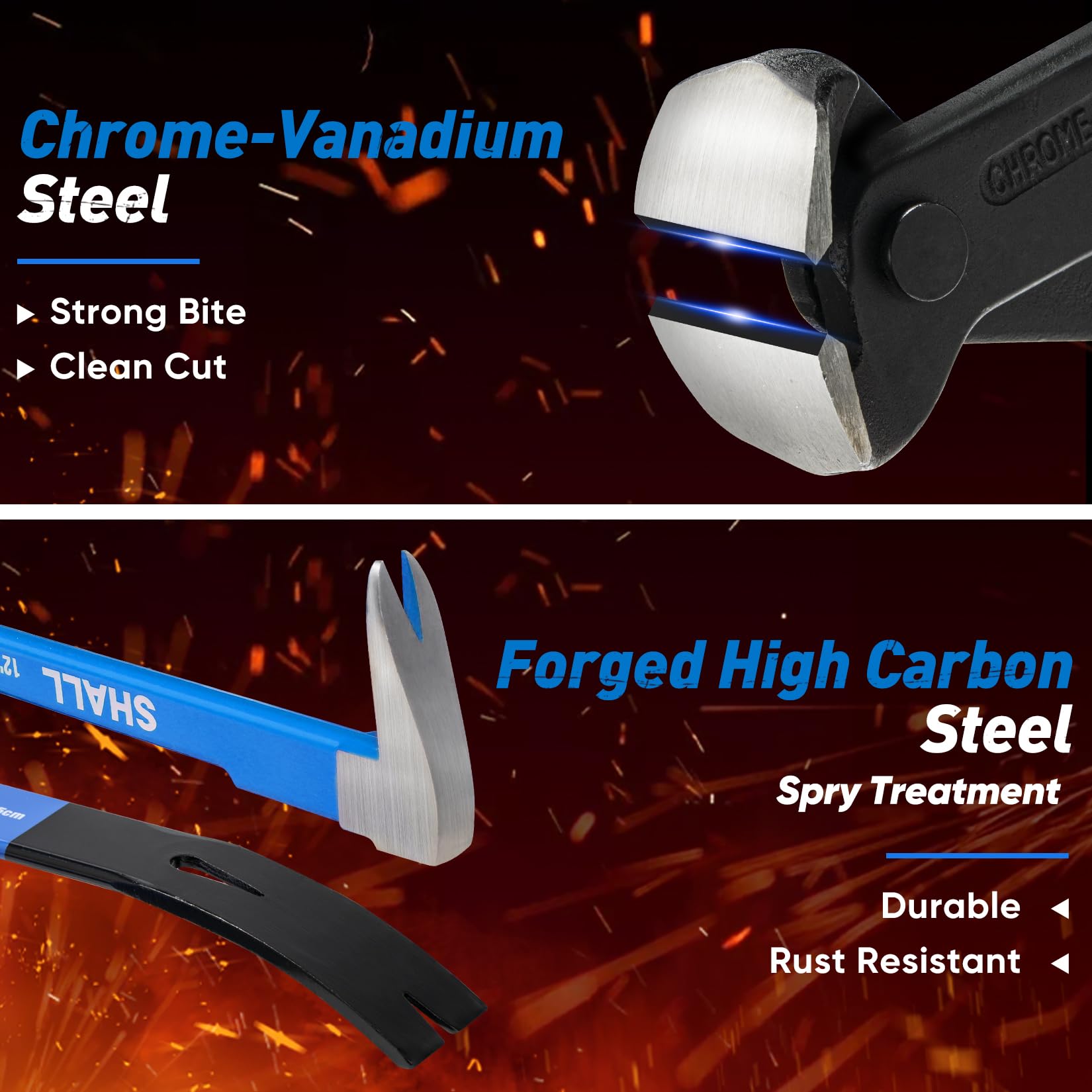 - Practical Pry Bar Set: Include a 12’’ heavy-duty cats paw nail puller, 10’’ & 7.5’’ flat pry bars, and end cutting nail puller pliers