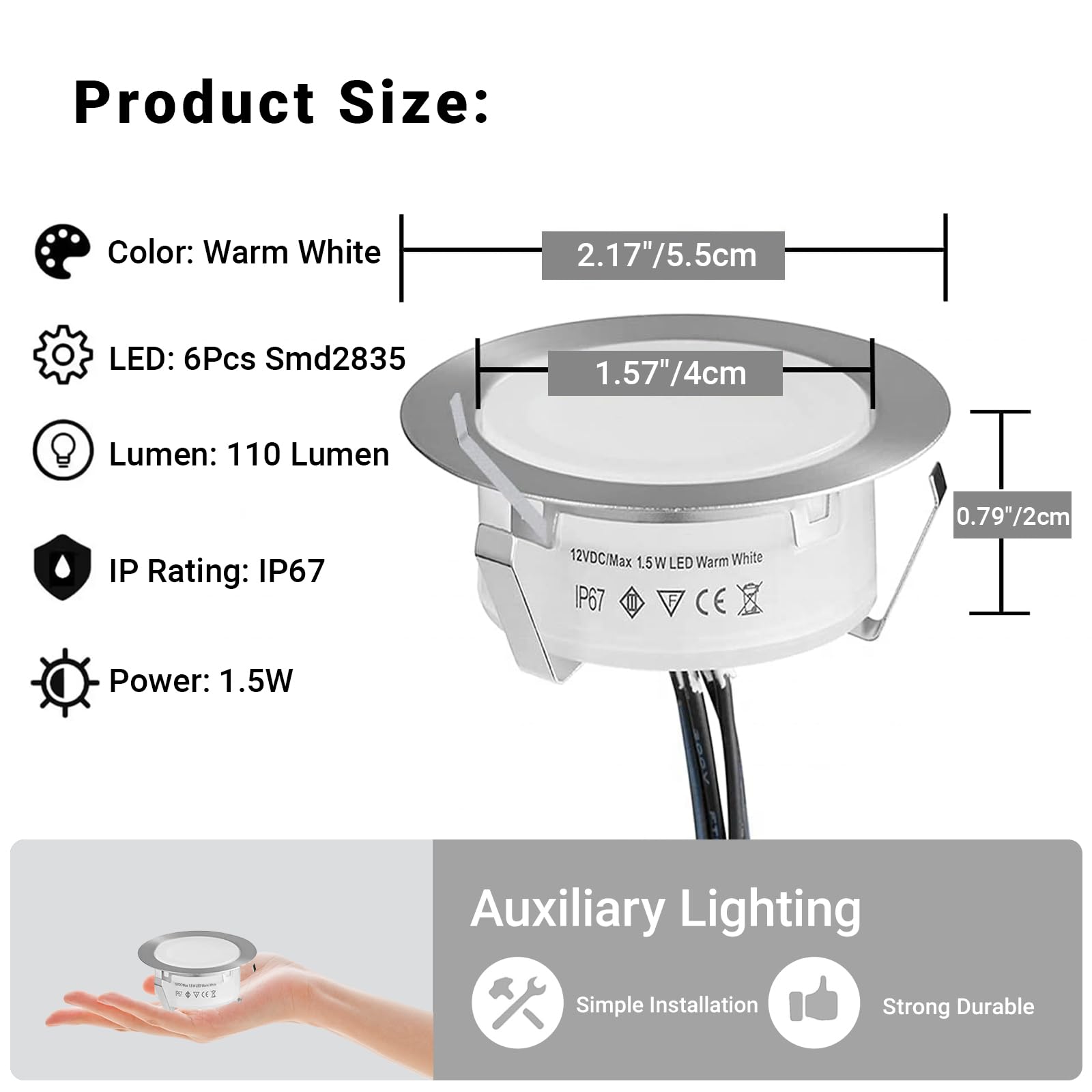 - Sauna Room Light: Warm white(2800K-3200K), diameter: 2.16 inch,depth : 0.79 inch,cut out: 1.65 inch, with 118 inch power cable, and max distance between 2 lights is 70 inch.adding a wonderful feeling to your home indoor / outdoor.