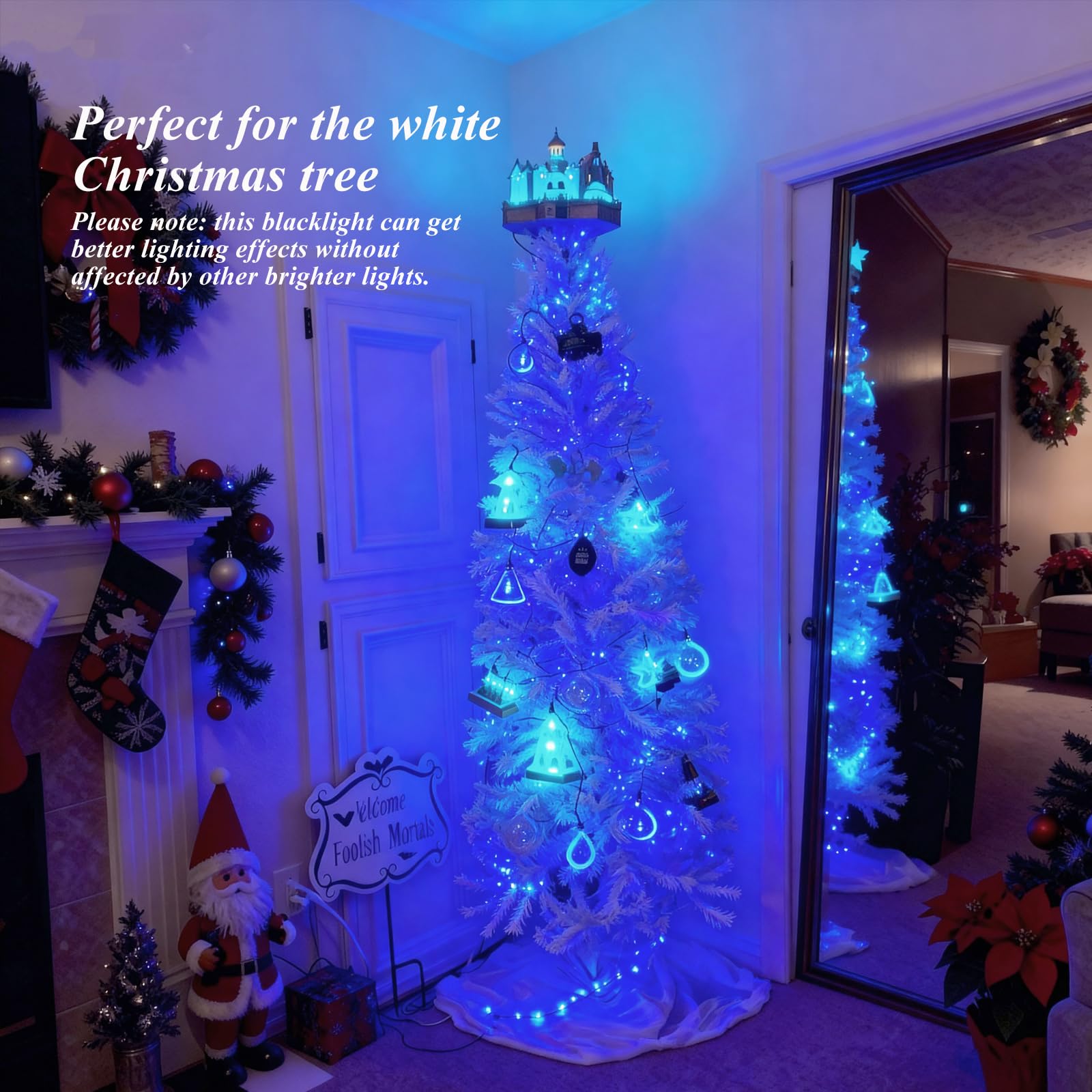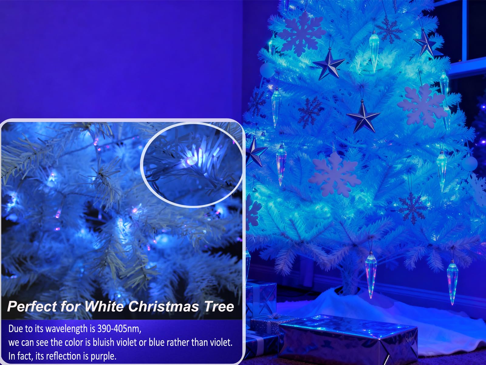 - -60ft Black Light: Experience premium quality with 240 unit LED lights on a 60 ft black light LED string, perfect for any event. They are great for decorating your room and will make it beautiful and mysterious! (Note: NOT Connectable). And they are perfect for decorating a white Christmas tree and will give you an unexpected effect.