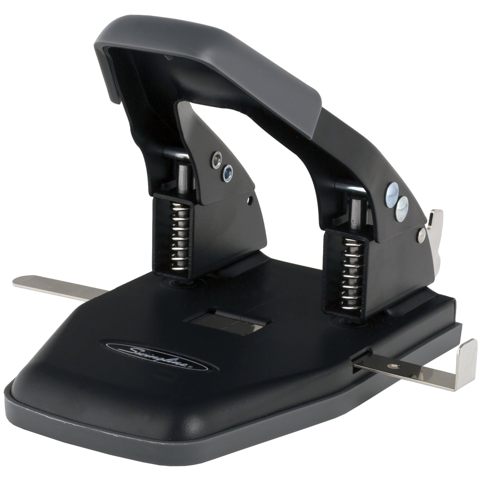 The Swingline Comfort Handle 2-Hole Punch is designed with ease in mind. Its metal construction ensures durable, long-lasting performance. The wide, comfortable handle is padded for user comfort and locks in closed position for easy storage. Designed to require less manual strength than traditional punches, this model requires 50% less effort to operate. Powerful punch cuts two precise ¼” holes through as many as 28 sheets. Cleanup of paper scraps is simple, with a removable non-skid tray on the base that ensures the punch stays in place, and allows for easy emptying. Adjustable paper guide provides accurate punch placement..