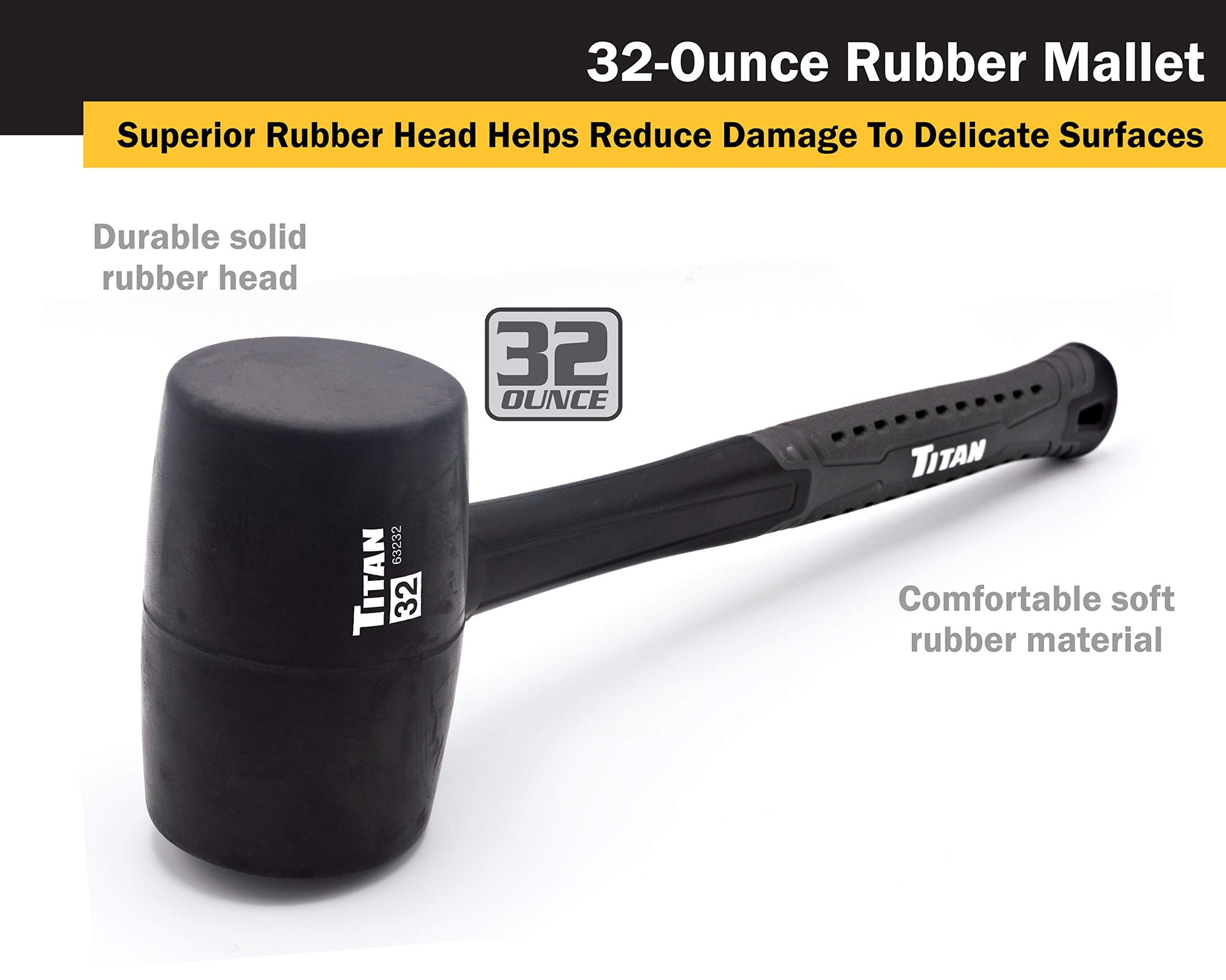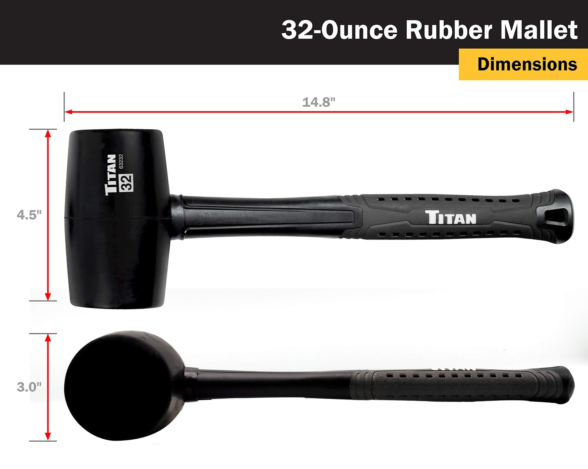Titan 63232 32oz Rubber Mallet, Non-marking Double-faced Solid Head, 15" Shock Absorbing Fiberglass Handle with Textured Grip