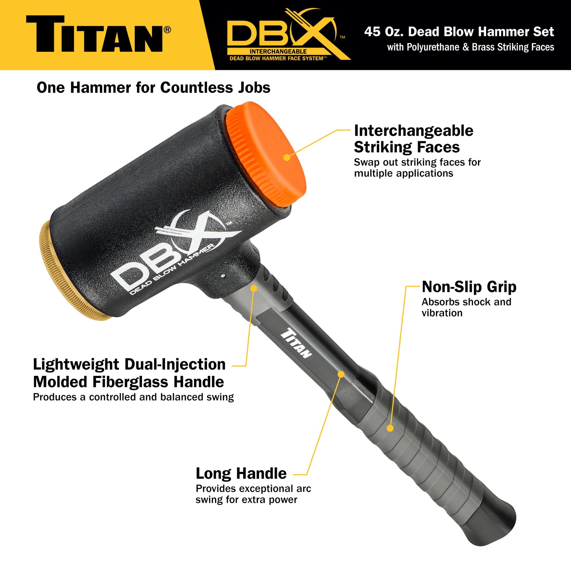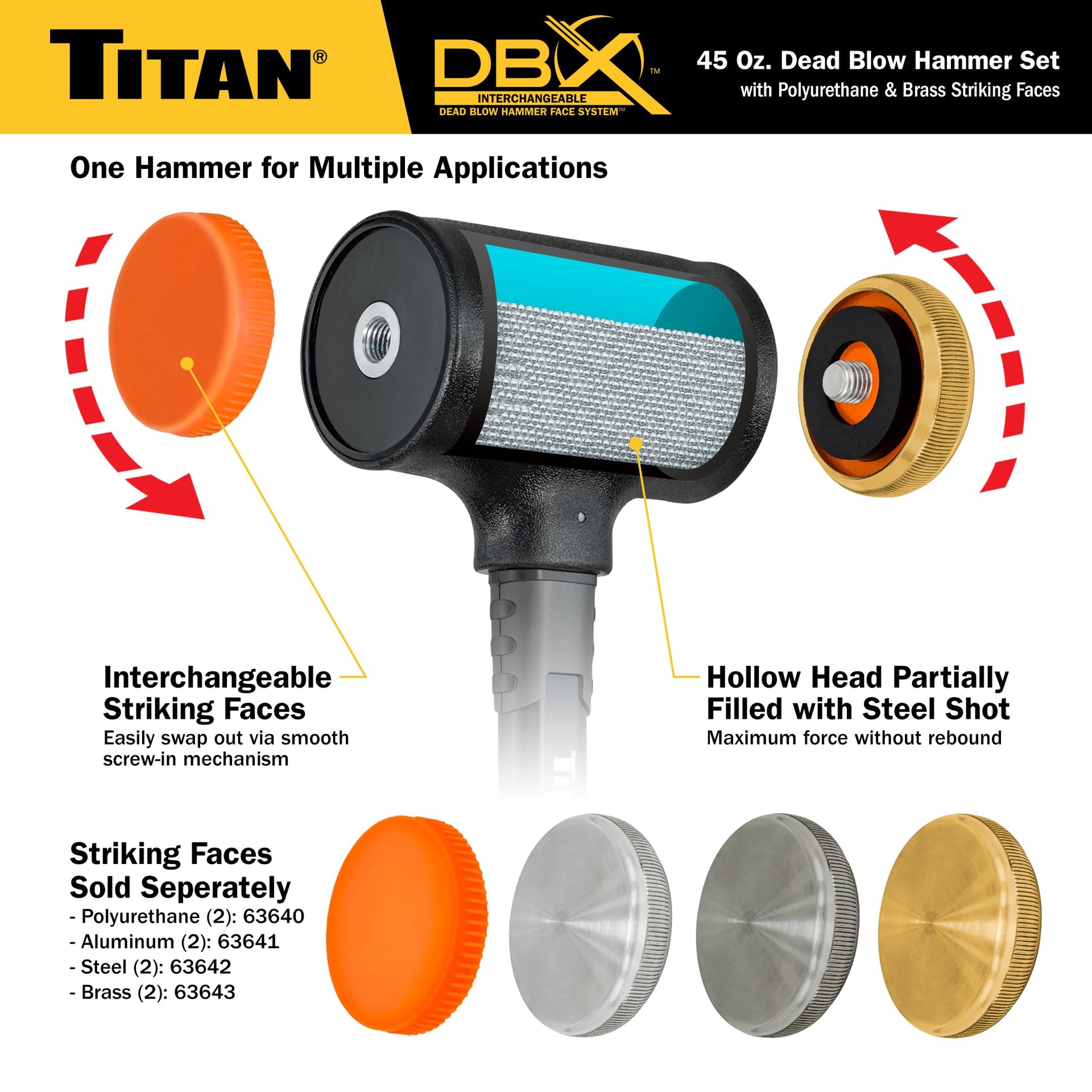 Details: The Titan dead blow hollow head is filled with steel shot that creates a dead blow effect for sustained impact and maximum force without rebound. The replaceable polyurethane convex striking face is non-marring and resistant to sparking, chipping and splitting. Thus, eliminating damage to the struck surface. The replaceable steel convex striking face is suitable for use on many metal surfaces. Lightweight and durable fiberglass handle with TPR grip enables a controlled swing, absorbs shock and vibration, while providing a non-slip grip. Replacement faces are available in many common materials for different applications. Available replacement faces are: Polyurethane #63640 Aluminum #63641 Steel #63642 Brass #63643