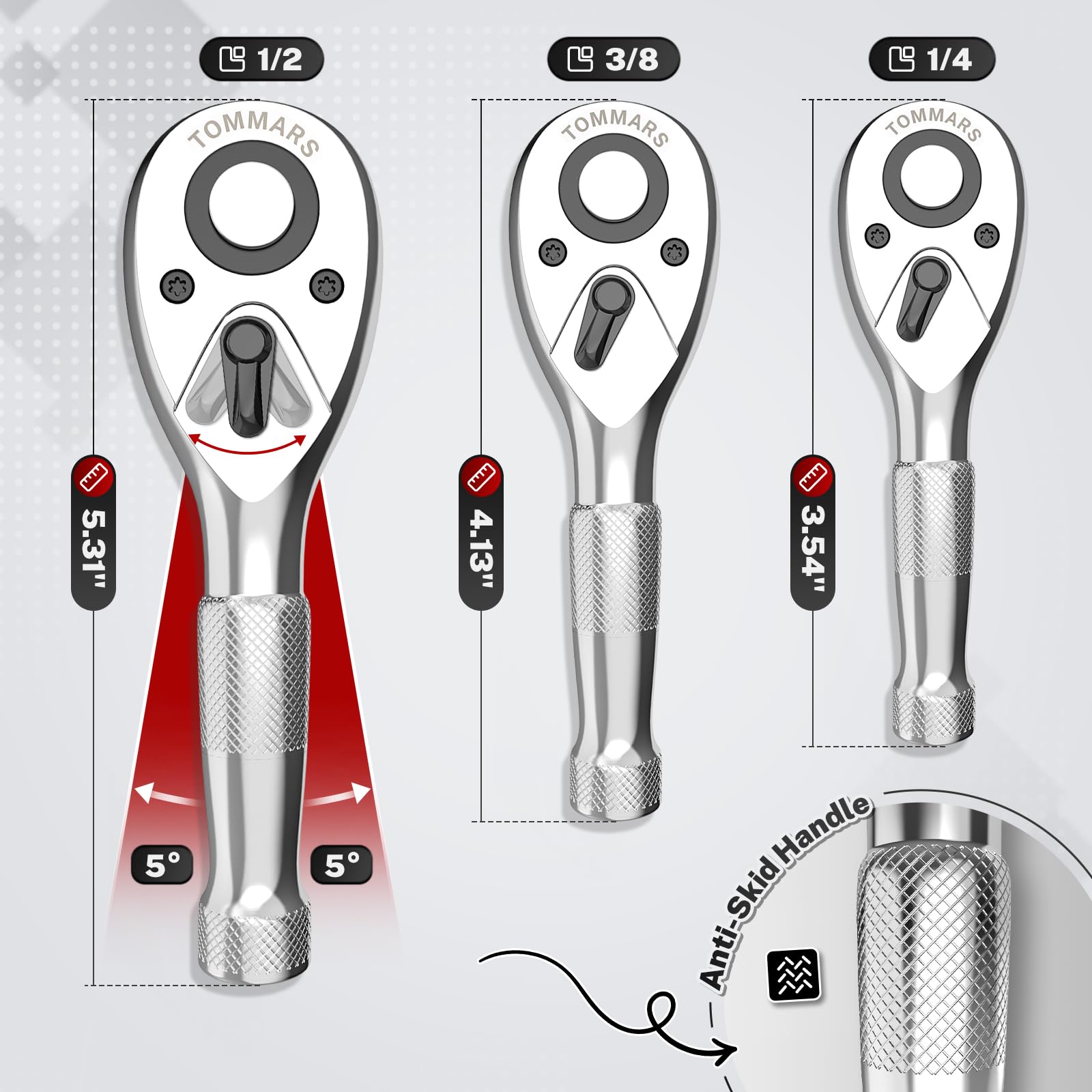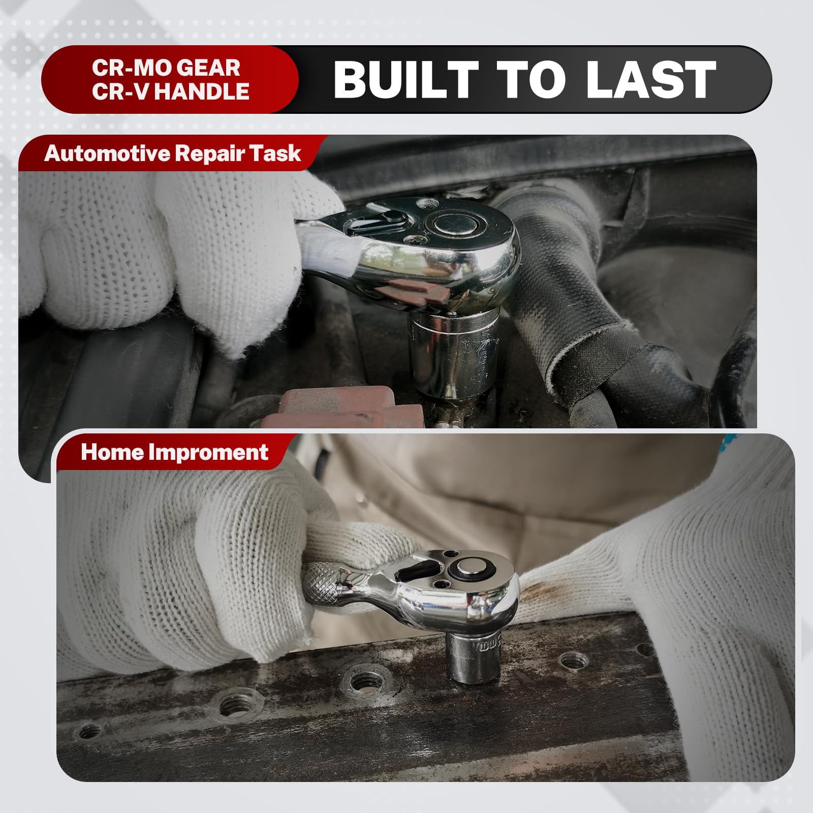 - 【Durability & Finish】The ratchet body is forged from premium Chrome Vanadium Steel (Cr-V) and features a full polished chrome finish. This combination provides high hardness and toughness, with a corrosion-resistant surface that's easy to clean, meeting the demands of professional use.