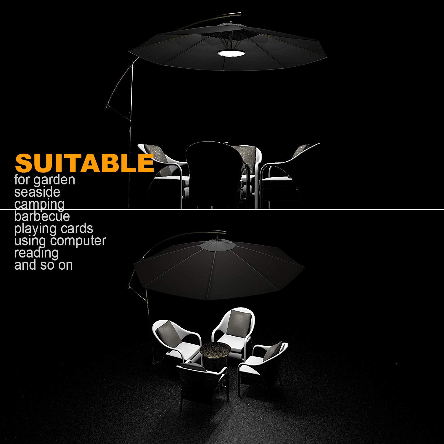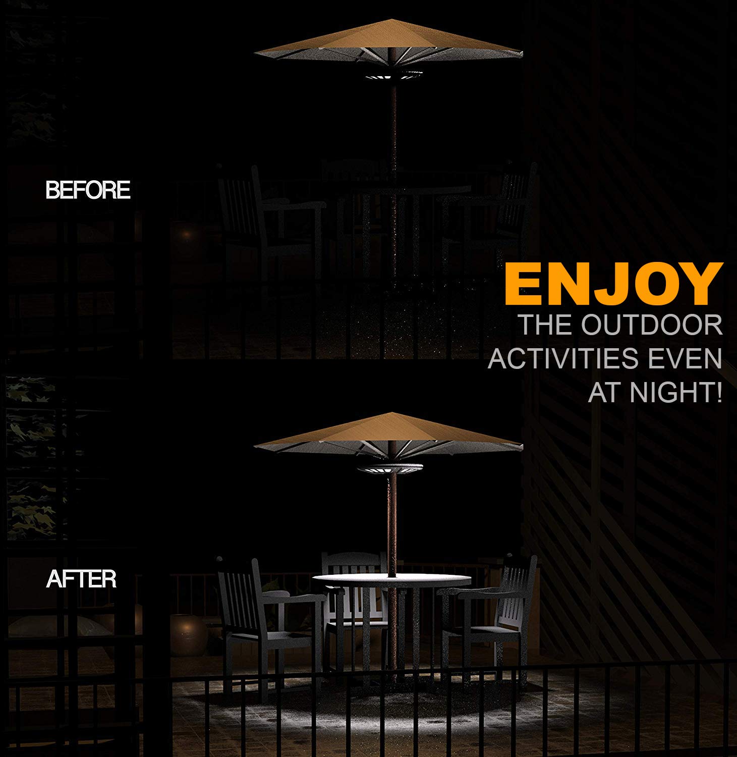 - ENJOY THE OUTDOOR ACTIVITIES EVEN AT NIGHT! Are you planning for a romantic dinner with your girlfriend, wife, partner? Or just like to hang out with friends or family playing cards, chess, scrabble or reading books and even for camping? Get this cordless backyard umbrella lamp now and see the unlimited fun and joyful evening to anyone close to you.