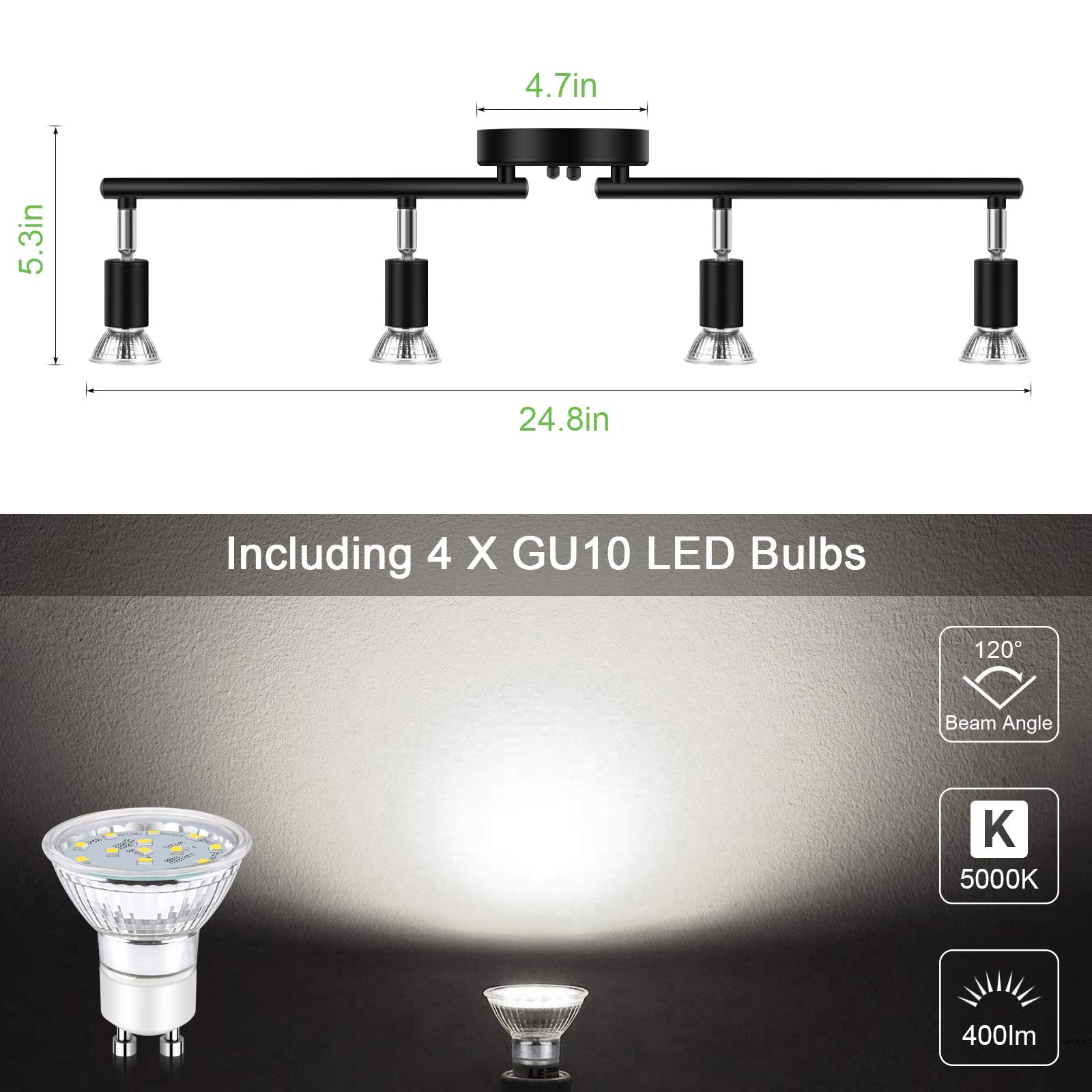 - Energy Saving: Includes 4 x 4 W GU10 led bulbs (not dimmable), 400 lumen light output, 5000 K daylight white 85 CRI, which produce a more accurate color rendering of the objects around it