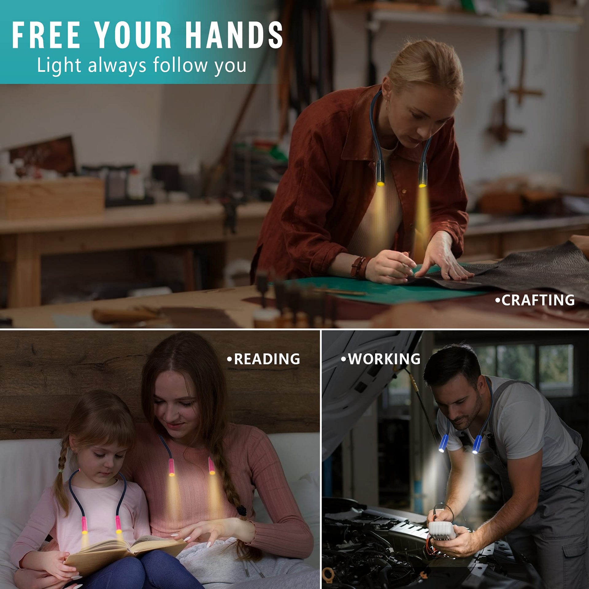 - 【Lightweight Hands-Free Book Light】Only 3.6 ounces in weight. Covered with high quality soft rubber, wear it around your neck to allow you to position and focus the light precisely, or you can fold it into any shape you need. Let you focus on what you're doing when you're reading or busy knitting, crafting, or crocheting without worrying about the light.