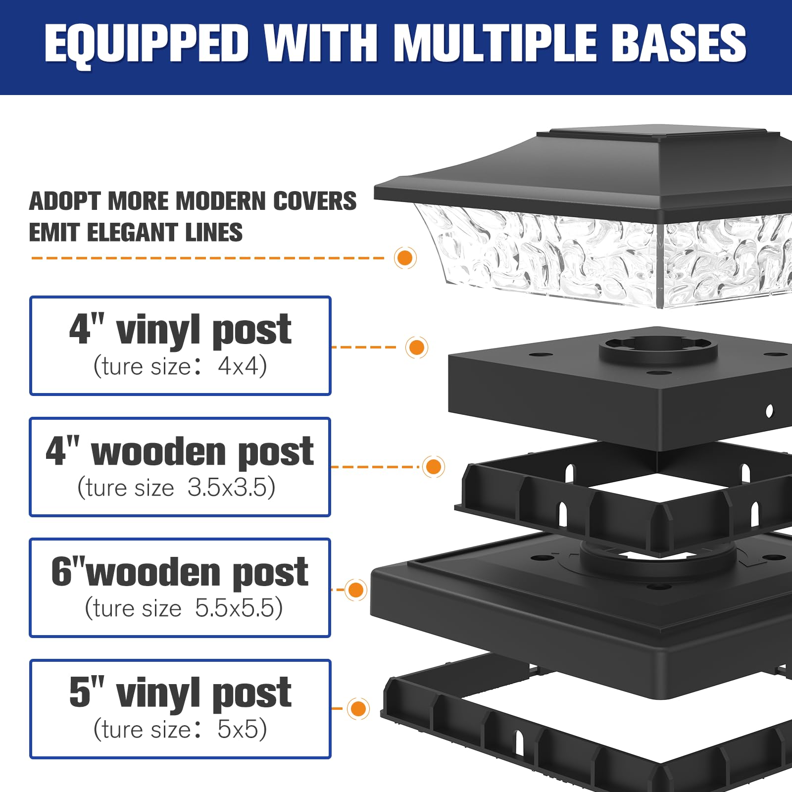 - [MULTIPLE BASES]Our solar fence post cap 4x4 come in a variety of sizes to suit your needs.Suitable for 4x4/6x6 wooden post or 4x4 vinyl post. No need for complicated wires. All you have to do is tighten the screws into the post to complete the installation