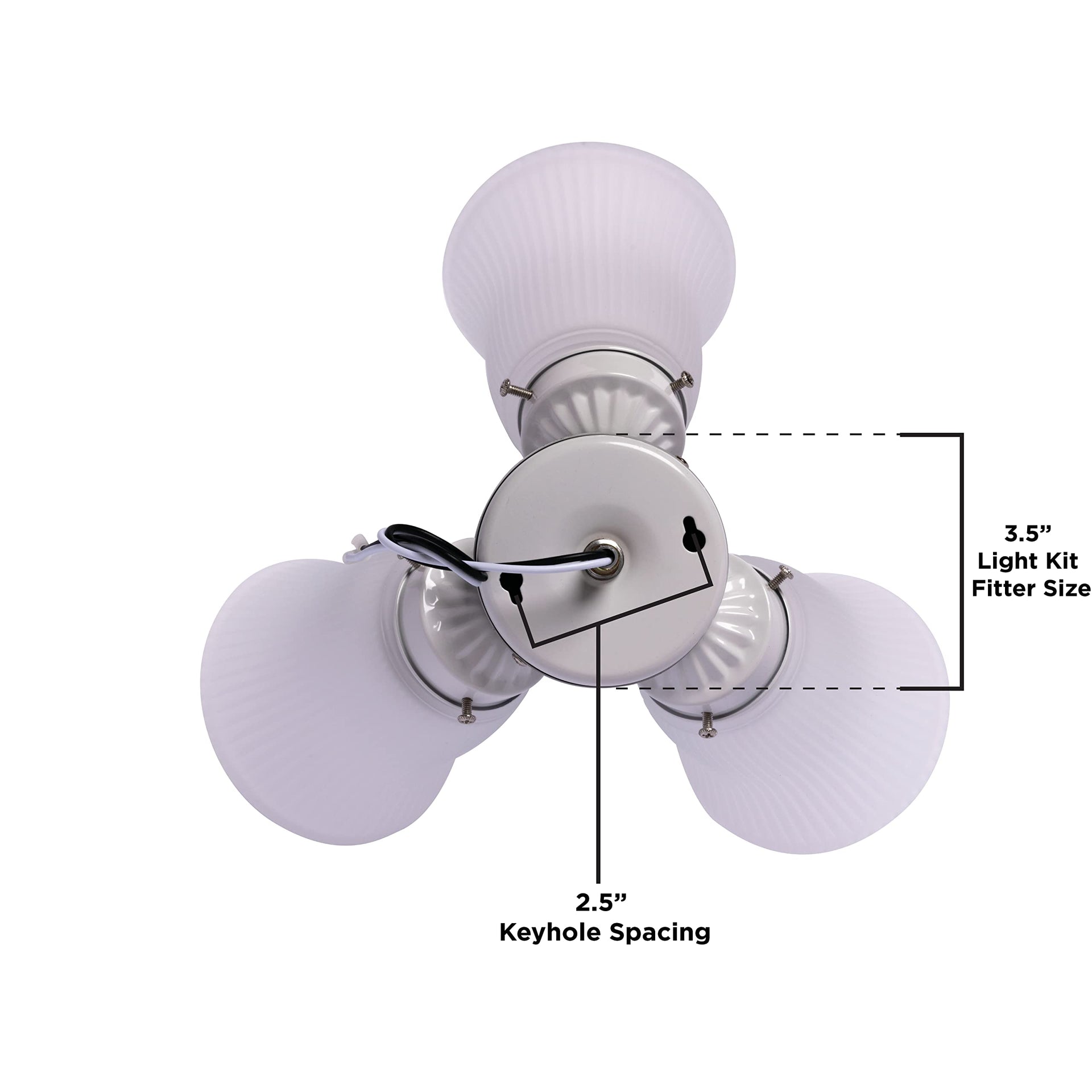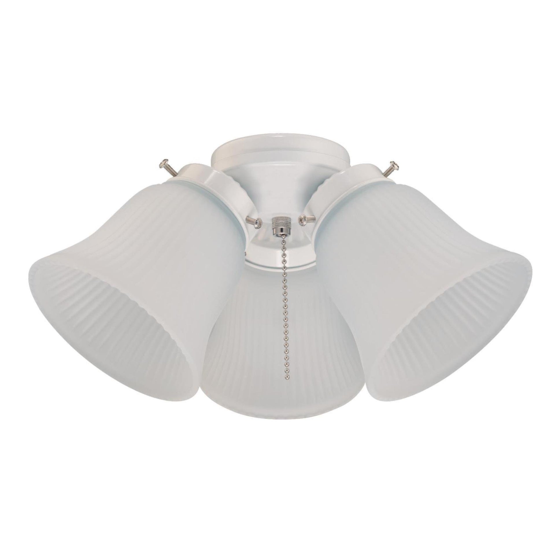Details: "The Westinghouse three-light cluster ceiling fan light kit includes energy and cost-saving LED light bulbs. They provide long-lasting, performance, bright illumination, and eliminate the need to change bulbs in hard-to-reach fans. With a clean white finish and three frosted ribbed glass shades, this light kit offers traditional style. Add an abundant source of beautiful lighting to any indoor ceiling fan. Westinghouse is a trusted, global brand. Westinghouse knows lighting and offers products with exceptional quality, reliability and functionality. Product reference number 77847."