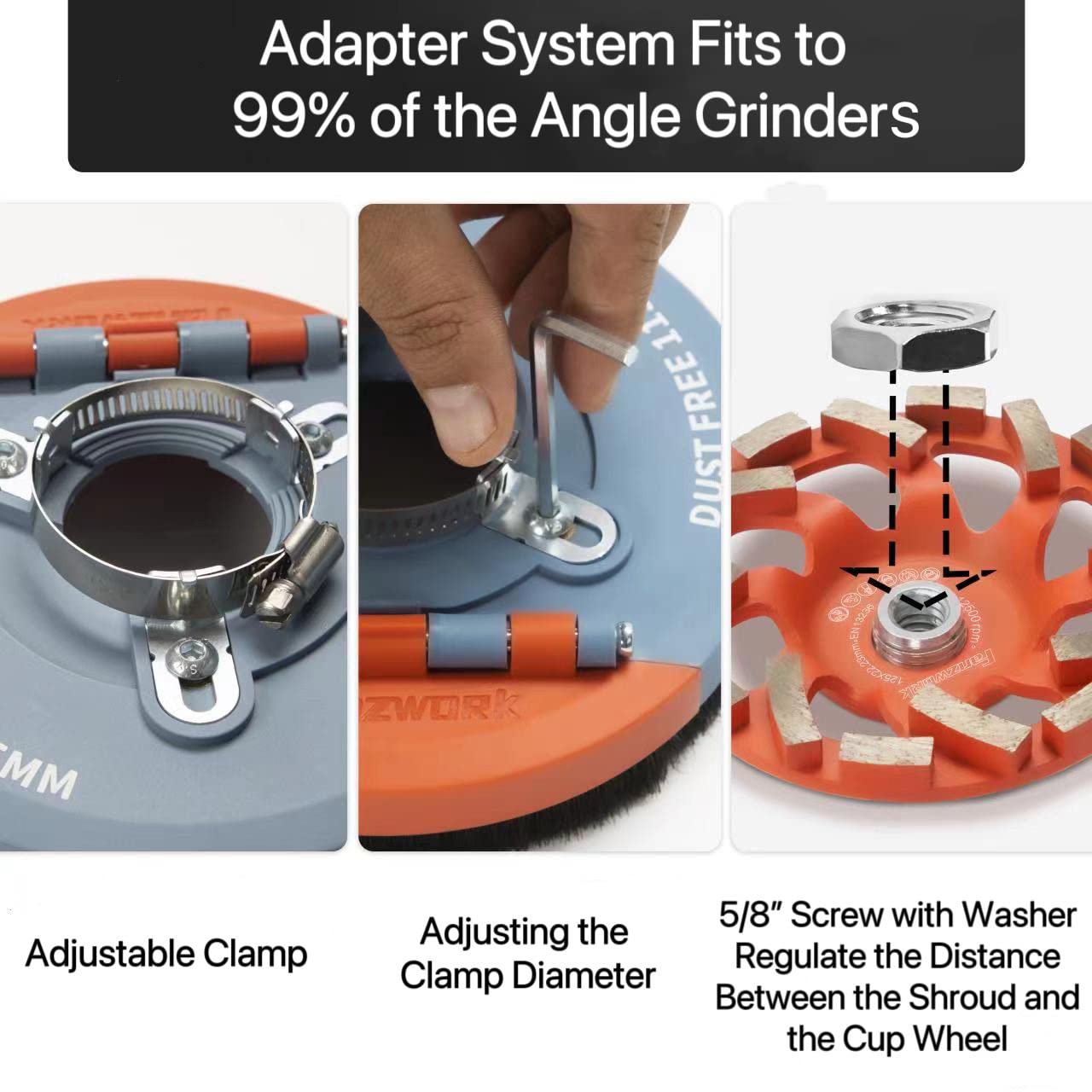 - PACKAGE INCLUDES - 1x dust shroud, 2x diamond cup wheel, 1x vacuum cleaner hose adapter, 1x replacement brush, shroud wrench, Allen key, 5/8" screw & washer