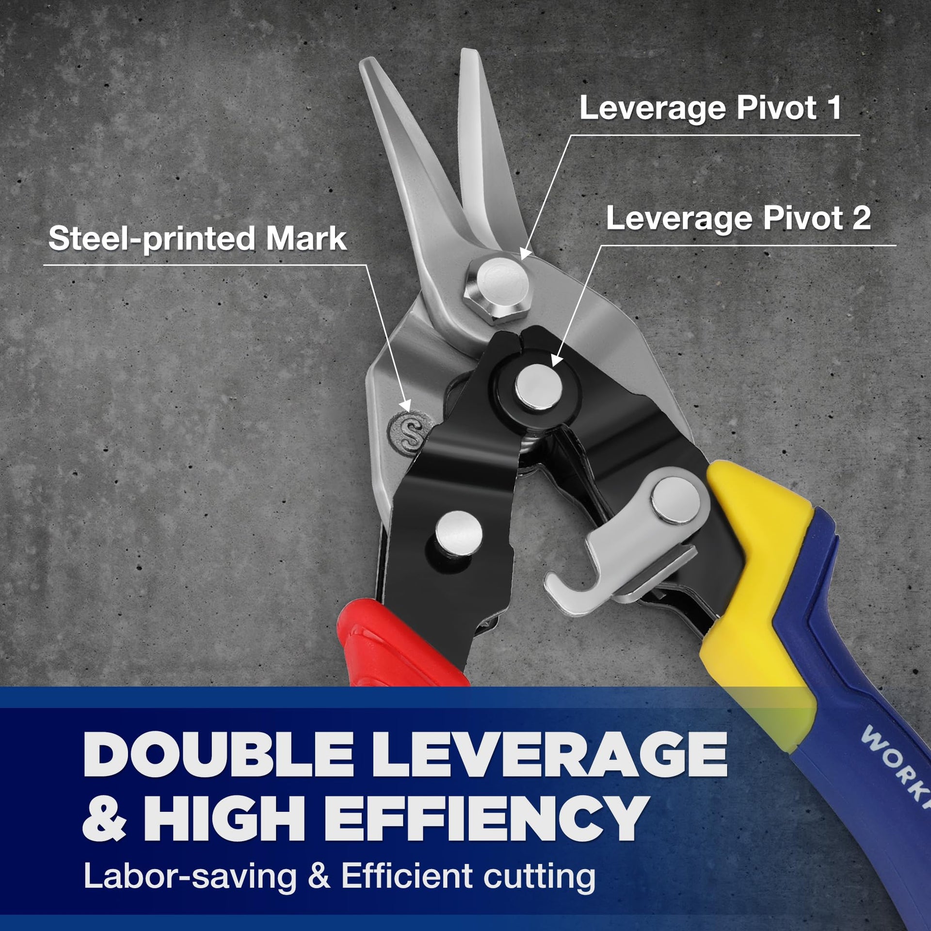 - Dual Leverage Design: The aviation snips feature a double-lever design with a more compact pivot, generating a large shearing force with less effort, saving labor, and increasing efficiency. The serrated cutting edge prevents materials from slipping, resulting in efficient and precise cuts