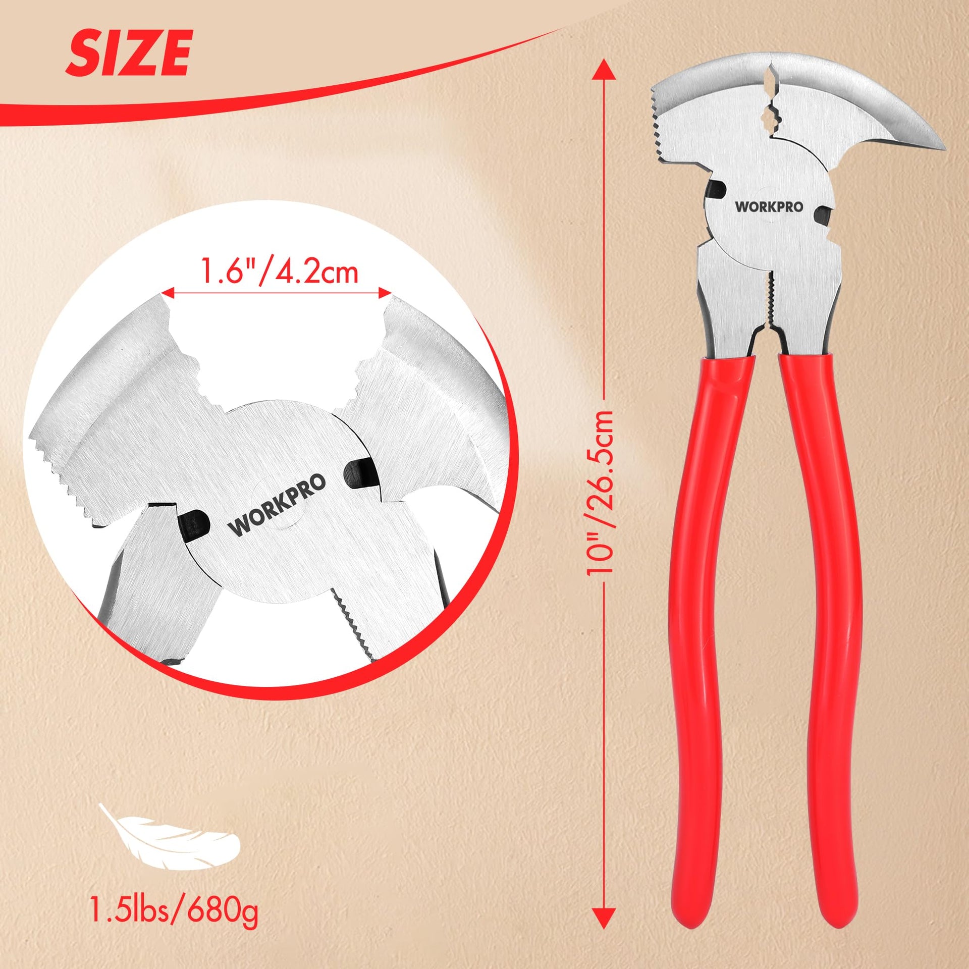 - Versatile Multi-Tool Fence Pliers: The WORKPRO 10-inch fence pliers combine six essential functions in one powerful tool. It is designed for versatility and includes wire cutting, nail pulling, staple removal, gripping, hammering, and twisting capabilities. Whether installing, maintaining, or repairing fences, this all-in-one tool allows you to cut, twist, pull, and hammer without switching between multiple tools