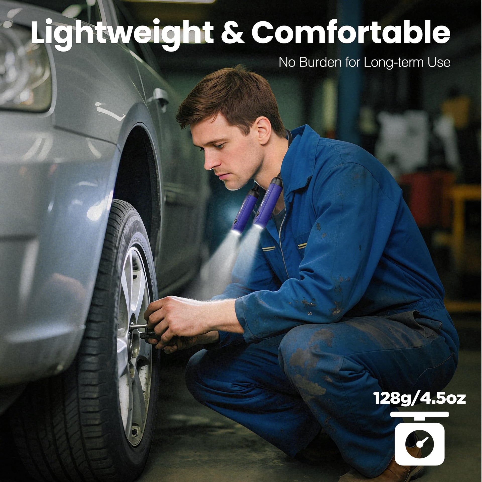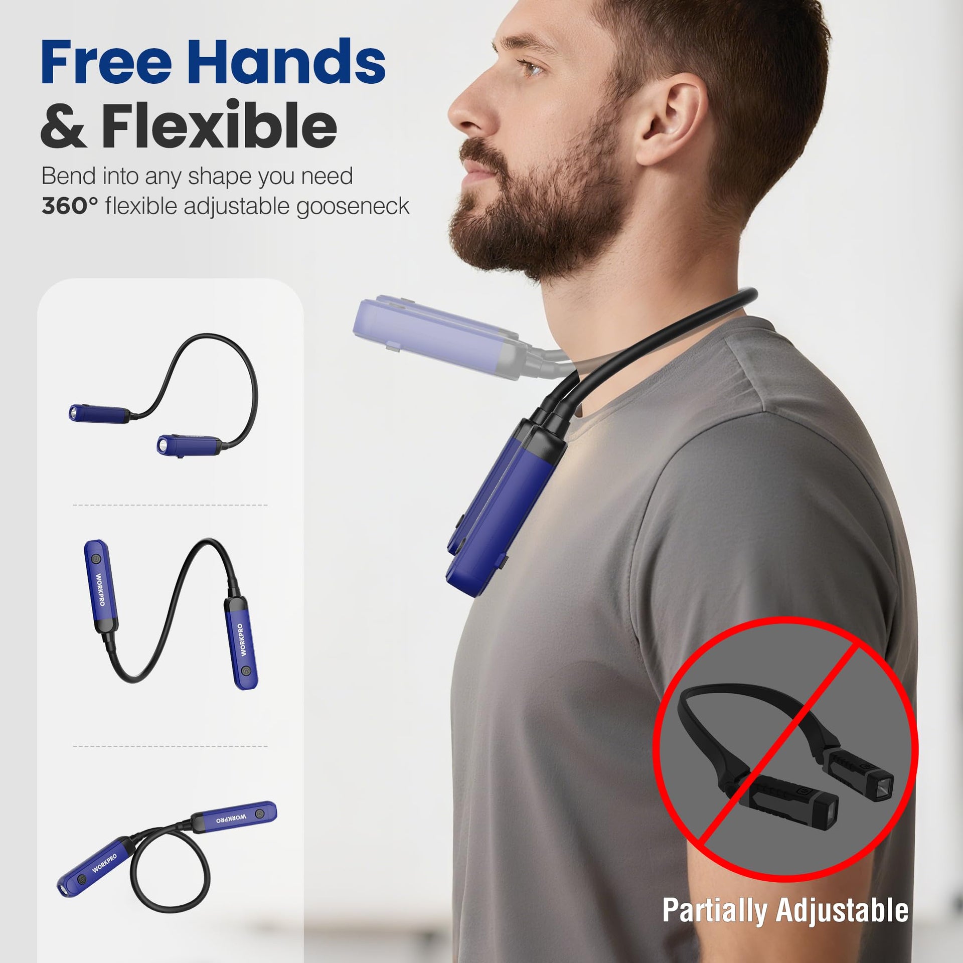 WORKPRO Rechargeable Neck Light – 300 Lumens, 3 Brightness Levels, Bendable Silicone Arm, Hands-Free for Reading, Camping, DIY, Blue/Black