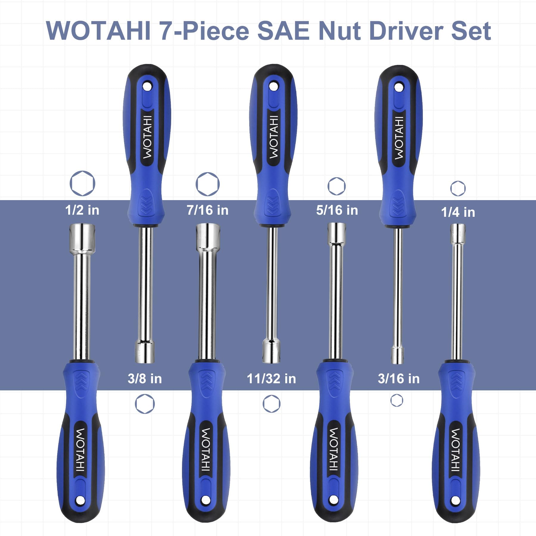 - The WOTAHI 7-Piece Nut Driver Set includes 3/16 in., 1/4 in., 5/16 in., 11/32 in., 3/8 in., 7/16 in. and 1/2 in. nut drivers