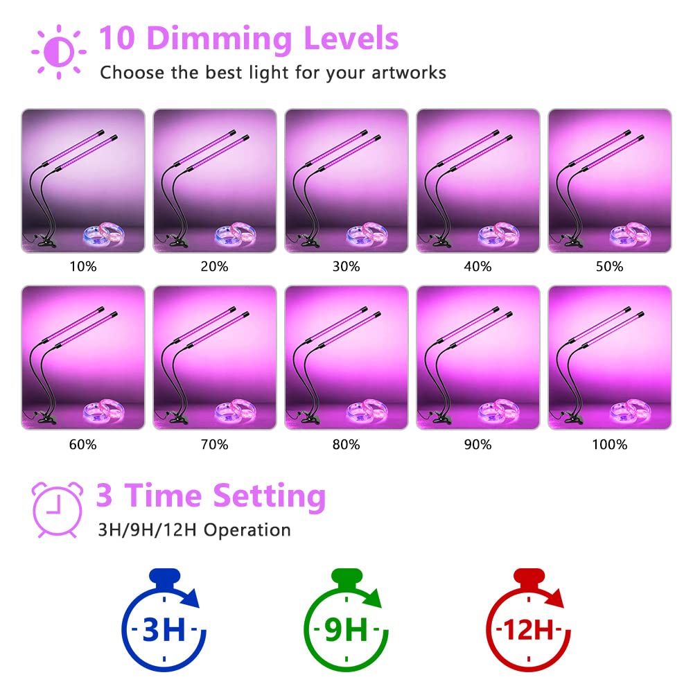 - Adjustable Design : Dual Head and 360 degree adjustment of luminous direction, Easier for you to adjust the angle and the distance between your artworks. 3 Timing modes, 3/9/12 hours, 10 dimmable Lightness, from 10% to 100%. It's light weight, easy to carry